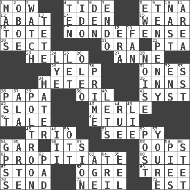 ACROSS 1. Cut the grass 4. Event that recurs at intervals 8. Inactive volcano in Sicily 12. Blind as ____ 14. Genesis locale 15. Erode 16. Carryall 17. Unrelated to defense, as in spending 20. Religious group 21. Mouth or opening 22. Parent Teacher Assoc. 23. Phone greeting 27. Queen of England 1702-14 29. Sharp bark 31. Singles 34. Distance measurement 35. Taverns 36. Dad 39. Petroleum 41. System (abbr.) 42. Slit 43. Haggard of country music 46. Story 47. Needle case 48. Musical group of three 51. Oozy 54. Slender fish 56. It is 58. I made a mistake 61. Appease 66. Costume for a special activity 67. Portico 68. Legendary monster 69. Family _ (genealogy) 70. Transmit 71. Famous astronaut Armstrong 72. Eastern Standard Time (abbr.) DOWN 1. Floor protectors 2. Mitch Miller's instrument 3. Observe 4. Nine, plus one 5. Wedding promise 6. Lair 7. Inside; within (prefix) 8. She-sheep 9. 3-inch nail 10. Political cartoonist Thomas 11. Type of rug 13. Wig 18. Period 19. Air blower 24. Potassium hydroxide 25. Allow 26. Butter sub 28. Annoying sound 30. First class 32. Followers of ems 33. Fast jet (abbr.) 34. Mother 36. Pacific Standard Time (abbr.) 37. Wing 38. Coward 40. Allows 44. Sorrow 45. Untruth 49. One more than two 50. Baseball player Mel 52. Mail 53. You are 54. Global Positioning Systems (abbr.) 55. Johnson of "Laugh-In" 57. The Jewish people; Israel 59. Sliced desserts 60. Proofreading order 62. Groovy apt. 63. Ripen 64. Three (prefix) 65. Snakelike fish