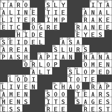 ACROSS 1. Edible starchy tuberous root 5. Cunning 8. Call ___ day 11. Place in a line 13. Neckwear 14. Of or related to the anus 15. 61 cubic inches 16. Naughty child 17. Libertine 18. And so on (abbr.) 19. Legendary monster 21. The wife of a rajah (variant) 22. Flintstone garb 24. Sight organs 25. Beer mug 27. White ___ sheet 29. Length times width 30. Runs notes together 32. Romantic infatuation 33. Bee-related 35. Grandmother 39. Fourth or lowest deck 41. Sign of something about to happen 42. The first octave above the treble staff 43. Inclined 45. Farming town in central California 48. Carryall 49. Make or become more lively 50. US Secretary of Labor Elaine L. _ 52. Reproach for some lapse or misdeed 55. So be it 56. "Barney Miller" actor Jack 57. Pulls apart 59. Not women's 60. ___ a Wonderful Life 61. Gurus 62. Curvy letter 63. Portuguese money of account (variant) 64. Take ten DOWN 1. Lie 2. Came down and settled, as after flight 3. Actors Guy, Robert Welles, and Clint 4. Single 5. Use a swizzle stick 6. Citrus frut 7. Slangy assent 8. Lacking in sense or substance 9. Receives possession of 10. Toward shelter 12. Eat (away) 14. Like ___ of sunshine 20. Set 21. Hitchcock's "____ Window" 23. Potato state 25. Plant excrement 26. Period 27. Chicken ___ king 28. Player for Phoenix 30. Small drink 31. Snout, nose 33. 100% 34. Cooking vessel 36. Electrical Measurement 37. Born 38. Plus 40. Water falling in drops from the sky 43. R.R. building 44. Plunders 45. Citrus fruits 46. Baking chambers 47. Cub Scout units 49. Unable to walk 50. ____ d'Azur (French Riviera) 51. Flexible conduit 53. Ancient Greek god of war 54. Inconspicuous attention getter 56. Title for a knight 58. Hearing organ