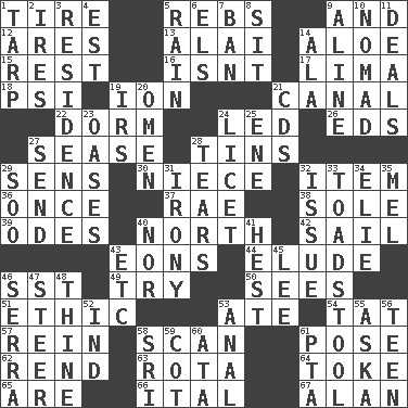 ACROSS 1. Become fatigued 5. Confederate soldiers (slang) 9. Also 12. Ancient Greek god of war 13. Jai ____ 14. _ vera 15. State of inaction 16. Is not 17. Pale green bean 18. Air pressure measure (abbr.) 19. Electrically charged atom 21. Lessep's creation 22. Dormintory (informal) 24. Directed 26. Begley and Asner 27. Gospel singer Marvin 28. Metal containers 29. Elected reps. 30. Sibling's daughter 32. Detail 36. Single time 37. Actress Charlotte 38. Not divided or shared with others 39. Lyric poems 40. 0 degrees 42. Move on water 43. Immeasurably long periods of time 44. Evade 46. Fast jet (abbr.) 49. Attempt to accomplish something 50. Observes 51. Moral principle 53. Had dinner 54. Make lace 57. It's straight from the horse's mouth 58. Skim 61. Airs 62. Tear apart 63. Roll call or roster of names 64. Puff or smoke 65. "We ___ not amused" (Victoria) 66. Slanted text style (abbr.) 67. Actor Alda or Thicke DOWN 1. Canvas cover 2. Angers 3. Dwelling 4. Eastern Standard Time (abbr.) 5. Water falling in drops from the sky 6. Raised railways 7. Bar 8. Be seated 9. Place in a line 10. Roamer 11. Allots cards 14. Wing 19. Big collection agency 20. Sign of something about to happen 21. Music discs 23. Fertile tracts in a desert 24. It is permitted: Lat. 25. Compass dir. 27. Transmit 28. Pulls into pieces 29. "Barney Miller" actor Jack 31. Literary sarcasm 32. Come out of 33. Inedible or poisonous agaric 34. Writer Wiesel 35. Cartoonist voice _ Blanc 40. And not 41. Command 43. And so on (abbr.) 45. Area sheltered from the wind 46. Father Junipero _ 47. Guide 48. One or ones belonging to thee 52. Working for oneself (abbr.) 53. Of or related to the anus 55. "____ silly question..." 56. Adolescent 58. Indian title of respect (Mr.) 59. Small bed 60. _ moment's notice (2 wds.) 61. Parent Teacher Association (abbr.)