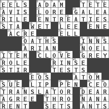 ACROSS 1. Snakelike fish 5. First of billions? 9. False hair 13. Advice 14. Old wives' tales, e.g. 15. An organ shaped like a helmet 16. Cause heat under the collar 17. Pleas 19. R.R. building 20. Dripping 21. Area sheltered from the wind 22. Compass dir. 23. Measure of real estate 25. Pipe bend 26. Expletives 30. Lodging establishments 34. Believer in; advocate of (suffix) 35. Christmas carol 36. A distinct part 39. Garlic unit 42. Jennifer or Joel 43. Hero or heavy, e.g. 44. Remove soap 46. Commotion 47. Trials 48. Greek goddess of the dawn 51. Smallest unit of an element 54. Institute legal proceedings 57. Mouth edge 58. Animal enclosure 60. Corporate head (abbr.) 62. Interpreter 65. Letter starter 66. Match 67. Through, poetically 68. Grandmother 69. Monthly bill 70. Arranges properly for use 71. Pismires DOWN 1. Hearing organs 2. Webber/Rice musical 3. Pale purple color 4. Compass dir. 5. Toward shelter 6. Do not 7. Nonscientific branch of learning 8. Haggard of country music 9. Make lace 10. Writer Wiesel 11. Adolescent 12. Relaxation 15. Highlander 18. Snakelike fish 20. Erode 24. Nomad 27. Nervous spasm 28. Actor Linden 29. Derisive sound 30. Swallow 31. And not 32. Born 33. Stealthy 36. Big collection agency 37. Small child 38. Biblical high priest 40. Compete 41. Followers of ems 45. Comedian Laurel of Laurel & Hardy 48. Otherwise 49. Petroleum 50. Arguments over trivial matters 52. Sea 53. Intended 54. Play the lead 55. Goad 56. Merit 58. Sweet dark-red dessert wine 59. Greek god of love 61. Mouths or openings 63. Remaining after all deductions 64. Definite Article 65. Heredity factor (abbr.)