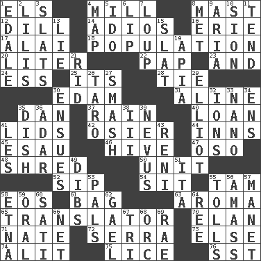 ACROSS 1. Raised railways 4. Place where flour is made 8. Vertical spar for supporting sails 12. Deli pickle 14. Goodbye (Sp.) 16. One of the Great Lakes 17. Jai ____ 18. Census information 20. 61 cubic inches 22. Infant food 23. Plus 24. Double-curved letter 25. ___ a Wonderful Life 28. Make a knot 30. Dutch treat 31. Place in a line 35. Daniel's nick name 37. Water falling in drops from the sky 40. Grant temporary use of 41. Flaplike coverings 42. Flexible twig of a willow tree 44. Taverns 45. Son of Isaac 46. Hub of activity 47. Bear (Spanish) 48. Fragment 50. A single undivided whole 52. Small drink 54. Be seated 55. Scottish cap 58. Greek goddess of the dawn 61. Paper or plastic container 63. Odor 65. Interpreter 70. Flair 71. Nathan's nickname 72. Father Junipero _ 73. Otherwise 74. Came down and settled, as after flight 75. Louse (plural) 76. Fast jet (abbr.) DOWN 1. Peak District village in England 2. Ms. Damita and namesakes 3. Narrow boards 4. Atlas unit 5. Wedding promise 6. Mouth edge 7. Central Nebraska county 8. Was introduced to 9. Roberta Peters solo 10. The Jewish people; Israel 11. Look after 13. Untruth 15. Narrow board 19. Capital of Western Samoa 21. To free from 26. Edible starchy tuberous root 27. Box-office sellout 29. American author Paul (1891-1958) 30. Follows as a consequence or result 32. Charged particles 33. Billionth: prefix 34. Followers of ems 35. Food container 36. The sixth month of the Jewish calendar 38. One more than two 39. Congenital growth or mark on the skin 41. French article 43. Painter Guido (1575-1642) 49. Rights 51. Call ___ day 53. Friends 55. For Whom the Bell _____ 56. Collect or gather 57. French painter Edouard 58. Inactive volcano in Sicily 59. Taken by mouth 60. Suttee (variant) 62. Highlander 64. To separate or throw off 66. Fish or hair follower 67. Three (prefix) 68. The grampus (Milton) 69. Actress Charlotte