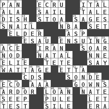 ACROSS 1. Baking dish 4. Shade of tan 8. Slanted text style (abbr.) 12. According to 13. Move on water 14. Story 15. Food container 17. Portico 18. Gurus 19. Slow-paced one 21. Basketball assoc. 23. Put into a specified state 24. A person who is older than you are 26. Viper 28. He sold his birthright 30. Following as a consequence or result 34. Adept person 37. SW Asia republic 39. Fly high 40. Allow head to fall sleepily 41. Relating to or accompanying birth 43. Compass dir. 44. Writer Wiesel 46. False hair 47. Declare 48. Electrical Measurement 51. Singer James 54. Music discs 55. Message 58. Environmental prefix 61. Auto club (abbr.) 63. Women's formal wear 65. Zeal 67. Grant temporary use of 71. Nathan's nickname 72. Ooze 73. Whine 74. Allow 75. Trial 76. Filth; sediment 77. Epoch DOWN 1. Groovy apts. 2. Place in a line 3. Rhinal 4. Double-curved letter 5. Feline 6. River (Sp.) 7. ____ Bator 8. Call ___ day 9. Labels 10. Toward shelter 11. For fear that 16. Flintstone garb 18. Backtalk 20. French article 22. Forbid 25. Water falling in drops from the sky 27. Product of festering 29. A salt of uric acid 30. Related on the mother's side 31. Charged particles 32. Nanny 33. Jennifer or Joel 34. Afresh 35. Root beer relative 36. Prepare for publication 38. Had dinner 42. Allows 45. And so on (abbr.) 49. The sixth month of the Jewish calendar 50. Girls' org. (abbr.) 52. Coat; cloak 53. At once, immediately (arch.) 56. A sleeping potion; an opiate (poet.) 57. Keyboard key 58. 90 degrees 59. Algonquian 60. Lyric poems 62. High mountains 64. Bristle 66. Choose 68. Fr. "Yes" 69. Everything 70. Born