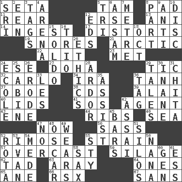 ACROSS 1. Stalk of a moss capsule 5. Scottish cap 8. Writing tablet 11. Located in or toward the back 12. Celtic language 13. Black tropical American cuckoo 14. Swallow 17. What propaganda does 19. Sounds asleep 21. Northern region 22. Set down 23. Was introduced to 24. Compass dir. 27. Capital of the state of Qatar 29. Nervous spasm 32. Monte _, Las Vegas Hotel/Casino 34. Retirement account (abbr.) 36. Hyperbolic tangent 37. Mitch Miller's instrument 38. Music discs 39. Jai _ 40. Hats (slang) 41. Distress signal 42. Representative 43. Compass dir. 44. Teases 46. Ocean 47. Immediately 50. Backtalk 52. Full of chinks, cracks, or crevices 55. Put through a sieve 57. Cloudy 59. Fodder prepared in a silo 62. Bit 63. Like ___ of sunshine 64. Singles 65. One (Scot) 66. Acura sports coupe 67. Without DOWN 1. _ Lanka 2. Car or cant ending 3. Labels 4. Sports stadium 5. Three (prefix) 6. Indian state 7. Distance measurement (Brit.) 8. Piece 9. Opposed to 10. Plate 12. Begley and Asner 15. Twentieth part of a lira 16. Musical group of three 18. Sep. follower 20. Principles of right and wrong 24. Learning spot: Fr. 25. Unit of acoustic absorption 26. Wear away 28. Zeal 29. Lies 30. Empty; void 31. Riviera of "Kiss of the Spider Woman" 33. French article 35. Help 36. Label 42. Slender Brazilian palm 45. Oblong pieces of solid material 47. Not either 48. Motion picture award 49. Puts on (as clothing) 51. Grain storage towers 52. Round or rotation of duties 53. "Terrible" tsar 54. Ancient Persian 55. Filthy place 56. Grandmother 58. Saxophone 60. Commissioned military rank (abbr.) 61. Double-curved letter