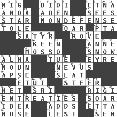 ACROSS 1. Russian fighter aircraft 4. "You Light Up My Life" star Conn 8. Inactive volcano in Sicily 12. Small Philippine buffalo 14. Arabian gulf 15. Perceives with the eye 16. Play the lead 17. Unrelated to defense, as in spending 20. Lacquered or enameled metalware 21. Boat paddle 22. Parent Teacher Association (abbr.) 23. Man with strong sexual desires 27. Be footloose 29. Peachy ____! 31. Singer Murray 34. With motion or animation 35. Overwhelm 36. _ mater 39. Third day of the wk. 41. Jane of fiction 42. Part of speech 43. Mole, birthmark 46. Domed church section 47. Narrow board 48. Needle holder 51. Bull 54. Was introduced to 56. _ Lanka 58. Swiss mountan, "Queen of the Mountains" 61. Pleas 66. Fly high 67. The content of cognition 68. Sums up 69. Singer James 70. Sense of smell 71. For fear that 72. Elected rep. DOWN 1. Vertical spar for supporting sails 2. To the inside or interior of 3. Finish lines 4. Daniel's nick name 5. Wedding promise 6. Lair 7. _ china 8. Compass dir. 9. 3-inch nail 10. A home for chicks 11. At sea 13. Length times width 18. Hearing organ 19. From 24. Ring climax 25. Consenting reply 26. Take ten 28. Flower holders 30. Parts of speech 32. Not either 33. She-sheep 34. French painter Edouard 36. Santa ___, CA 37. Trim (branches) 38. French bagpipes 40. Snakelike fish 44. Large container 45. Shoshoni 49. Purpose 50. Retirement account (abbr.) 52. Celtic language 53. Disturbances 54. Count _ (2 wds.) 55. Inside; within (prefix) 57. Slanted text style (abbr.) 59. Yard entry 60. SW Asia republic 62. Actress Charlotte 63. Binary compound 64. Begley and Asner 65. Fast jet (abbr.)