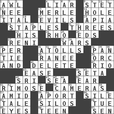 ACROSS 1. Leather borer 4. One who doesn't tell the truth 8. Proofreading order 12. Born 13. Haggard of country music 14. Hollow 15. Slanted text style (abbr.) 17. Vices 18. Capital of Western Samoa 19. Paper fasteners 21. Threesomes 23. Part of HMS, perhaps 24. 17th letter of the Greek alphabet 26. Begley and Asner 27. Painter Guido (1575-1642) 28. Armed conflicts 30. For each 31. Ringlike coral islands and reefs 34. Baking dish 37. Make a knot 38. The wife of a rajah (variant) 39. The grampus (Milton) 40. Plus 41. Keyboard key 42. River (Sp.) 43. Relaxation 44. Stalk of a moss capsule 46. Indian title of respect (Mr.) 47. Ocean 50. Hearing organ 51. Full of chinks, cracks, or crevices 54. Devices for capturing images 57. Among 58. To the left, to Queeg 60. Filth; sediment 62. Story 63. Grain storage towers 64. Third day of the wk. 65. Sight organs 66. Adolescent 67. Elected rep. DOWN 1. Black tropical American cuckoo 2. Moistens 3. Resembling or made to resemble leather 4. Prying instrument 5. From or relating to Ireland 6. 100% 7. State of inaction 8. Broken pieces 9. Drinks excessively 10. Writer Wiesel 11. Afternoon social gatherings 13. Cartoonist voice _ Blanc 16. (Had) reclined 20. Air pressure measure (abbr.) 22. Possessive pronoun 25. A small or young owl 27. It's straight from the horse's mouth 29. Toward shelter 30. Parent Teacher Association (abbr.) 31. Ancient Greek god of war 32. Falsehoods 33. Single 34. Likenesses of persons 35. Roberta Peters solo 36. Non-commissioned officer (abbr.) 41. Raised platform 43. Eats (away) 44. Perceive with the eye 45. Hearing organs 46. Grin 48. Learning spot: Fr. 49. Composer Copland 51. Assign a rank or rating to 52. "If ____ say so..." 53. 90 degrees 55. Mountains (abbr.) 56. Change direction abruptly 59. Sliced dessert 61. Car or cant ending