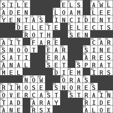 ACROSS 1. Drop; flow; fall 5. Raised railways 8. Leather borer 11. Arabian gulf 12. Rich soil 13. Area sheltered from the wind 14. Gossips 17. Happening 19. Keyboard key 21. Opts 22. Writer of Portnoy's Complaint (1969) 23. Elected rep. 24. Small island 27. Conductor's collection 29. Automobile 32. Snob 34. Hearing organ 36. Trig term 37. Suttee (variant) 38. Epoch 39. Ancient Greek god of war 40. Of or related to the anus 41. Put into a specified state 42. Small fatty European fish 43. Cartoonist voice _ Blanc 44. South Vietnam president (1954) 46. Big collection agency 47. At this time 50. Mouths or openings 52. Full of chinks, cracks, or crevices 55. Sounds asleep 57. Cloudy 59. Put through a sieve 62. Bit 63. Like ___ of sunshine 64. Travel on or in a vehicle 65. A saturated hydrocarbon 66. Acura sports coupe 67. _ vera DOWN 1. Declare 2. Binary compound 3. Grant temporary use of 4. Keyboard key 5. Period of immesurable duration 6. Shoestrings 7. Grin 8. Actor Baldwin 9. Gone 10. Allows 12. Untruth 15. Upward 16. Bristle 18. Lair 20. Trios 24. Indian state 25. Silly 26. Add up to 28. Having ears or earlike features 29. High-altitude cloud 30. Approach 31. Musical pauses 33. Petroleum 35. Food allowance for one day 36. Plant excrement 42. Don Adams' spy role 45. Greek god of love 47. Not either 48. Motion picture award 49. Erodes 51. Father Junipero _ 52. Round or rotation of duties 53. _ the terrible 54. Ancient Persian 55. Filthy place 56. Travel by water 58. Saxophone 60. Wedding promise 61. Born