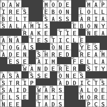 ACROSS 1. Simpleton 4. Method 8. Atlas unit 11. Angers 13. Inky black, to poets 14. Hang loosely or laxly 15. Waist strap 16. Backtalk 17. Operatic vocal solo 18. Deli grouping 21. Black 22. Libertine 23. Make a knot 25. Teachers' org. 26. Santa ___, CA 29. A testis 32. Ancient Roman robes 34. Single 35. Consenting reply 38. An important port of Yemen 39. Tear up 41. 480, 500 or 516 sheets of paper 43. Compass dir. 44. Direct toward a target or goal 45. Chap (slang) 46. Roamer 50. Filthy place 51. White ___ sheet 54. Compass dir. 55. Washington bills 57. Empty completely 59. Inveterate users 63. Stated 64. Armed conflicts 67. Medicinal plant 68. Otherwise 69. Give off 70. Greater amount 71. Born 72. Small boys 73. Personal Computers (abbr.) DOWN 1. Claim 2. Length times width 3. Water source 4. Makes clutter 5. Chief or king in Benin or Nigeria 6. Two (Sp.) 7. Followers of ems 8. Person of subnormal intelligence 9. Place in a line 10. Beach, in Buenos Aires 12. Play the lead 14. Experiment locale 19. Floor coverings 20. Mamie's mate 21. Snakelike fish 23. Prong on a fork 24. On the rocks 26. "One Day ___ Time" 27. Thickened enlargement 28. Grows older 30. Singer Mel 31. Jane of fiction 33. Afresh 36. Snakelike fish 37. Table seasoning 39. Without 40. Flintstone garb 42. Can I? 45. Flintstone 47. Viper 48. Ridicules or criticizes harshly 49. Conclusion 51. NE Netherlands city 52. Having lost freshness 53. Ascend 56. Thailand, formerly 58. Binary compound 60. Hoof sound 61. Torque (variant) 62. Observes 64. Soggy 65. Housemaid (var.) 66. To free from