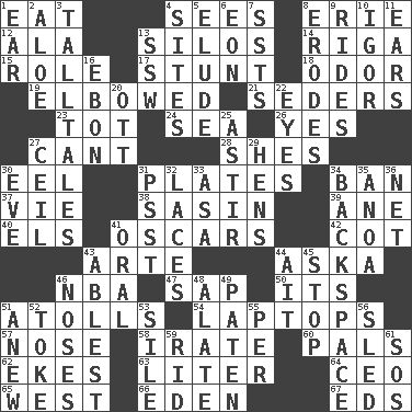 ACROSS 1. Ingest 4. Observes 8. 4th largest of the Great Lakes 12. Wing 13. Grain storage towers 14. Port city in Latvia 15. Hero or heavy, e.g. 17. Difficult or unusual or dangerous feat 18. Aroma 19. Turned at an angle; bent 21. Spring feasts 23. Small child 24. Ocean 26. Consenting reply 27. Patter 28. "______ My Girl" (Turtles hit) 30. Snakelike fish 31. Food holders 34. Forbid 37. Compete 38. Indian antelope 39. A saturated hydrocarbon 40. Raised railways 41. Motion picture awards 42. Small bed 43. Johnson of "Laugh-In" 44. "____ silly question..." 46. Basketball assoc. 47. Plant excrement 50. ___ a Wonderful Life 51. Ringlike coral islands and reefs 54. Portable computers 57. Olfactory organ 58. Feeling or showing extreme anger 60. Friends 62. Supplements with great effort 63. 61 cubic inches 64. Corporate head (abbr.) 65. Compass direction 66. Paradise 67. Begley and Asner DOWN 1. Ewer handle 2. _ vera 3. Baron Munchausen's specialties 4. Locates 5. Evade 6. Period of immesurable duration 7. Fast planes 8. Eats (away) 9. Amusement-park features 10. Composer Stravinsky 11. Hearing organs 13. Compass dir. 16. Inky black, to poets 20. Baseball player Mel 22. Sight organs 25. Having gotten out of bed 27. To provide with a ceiling 29. Coop moms 30. First lady 31. Inconspicuous attention getter 32. Shoestrings 33. White ___ sheet 34. Keyboard key 35. Small Philippine buffalo 36. Fish or hair follower 41. Relating to the mouth 43. Most capable 44. Small island 45. Cease 46. Olfactory organs 48. Having winglike extensions 49. Eucharist need 51. Afresh 52. Puff or smoke 53. Filth; sediment 55. For each 56. Downhill vehicle 59. To free from 61. Distress signal