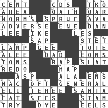 ACROSS 1. Penny 5. Music discs 8. Ring climax 11. Type of rug 12. Pledge 14. Rowing implement 15. Typical standards 17. Upset 18. Actress Gardner 19. Contrary to your interests or welfare 21. Compass dir. 22. One of the 12 tribes of Israel 23. Area sheltered from the wind 24. Eisenhower's nickname 25. French article 27. Plant excrement 28. Proofreading order 31. Desk light 35. Unit of force equal to gravity 37. Carryall 38. Toward shelter 39. Male parent 41. Immeasurably long periods of time 42. Charged particles 43. Strike 45. Narrow board 46. Make new 47. Atlas unit 49. Viper 51. In the manner of 52. Followers of ems 55. Big _ 57. Often (poetically) 60. Commissioned military rank 62. Biblical high priest 63. Giggle 65. Before Barbara or Clara 66. Consume 67. Observes 68. Thailand, formerly 69. Attempt to accomplish something 70. Color 71. Snakelike fish DOWN 1. Lessep's creation 2. Wear away 3. Boldness 4. Docile 5. Police officer (slang) 6. Have the gumption 7. Surprise greatly 8. Inedible or poisonous agaric 9. Polynesian shrub of the pepper family 10. NW Algerian seaport 13. Person who is morally reprehensible 16. Indian titles of respect 17. Oozed 20. Heroin 26. _____ Park, CO 29. Inactive volcano in Sicily 30. Trial 31. Den 32. _ vera 33. Ananias' fault 34. Mexican monetary units 36. Hearing organ 40. Break 44. Diluted with white 48. Zero-star reviews 50. Plant holders 52. Bert's buddy 53. Relating to or accompanying birth 54. Criticizes harshly 55. Rendezvous 56. Having or resembling wings 58. Nourish 59. Those people 61. Comfort 64. Compass dir.