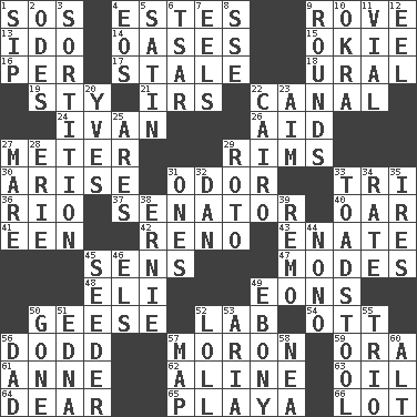 ACROSS 1. Mayday 4. _____ Park, CO 9. Be footloose 13. Wedding promise 14. Fertile tracts in a desert 15. Migrant worker of the '30s 16. For each 17. Having lost freshness 18. Mountain range 19. Filthy place 21. Big collection agency 22. Lessep's creation 24. "Terrible" tsar 26. Assist 27. Distance measurement 29. Basketball hoops 30. Originate 31. Scent 33. Three (prefix) 36. River (Sp.) 37. Legislator 40. Rowing implement 41. Car or cant ending 42. Western Nevada city 43. Maternal 45. Elected reps. 47. Methods 48. Biblical high priest 49. Immeasurably long periods of time 50. Honkers 52. Experiment locale 54. Baseball player Mel 56. Texas town _ City 57. Person of subnormal intelligence 59. Mouth or opening 61. Singer Murray 62. Place in a line 63. Petroleum 64. Letter starter 65. Beach, in Buenos Aires 66. Car dealer's back yard DOWN 1. Small drink 2. Lyric poems 3. Determination 4. Greek goddess of the dawn 5. Smooth fabric 6. Russian ruler of old 7. Snakelike fish 8. Compass dir. 9. Periods in a boxing match 10. Gumbo ingredient 11. Small bottle 12. Snakelike fish 20. Jacques Cousteau's middle name 22. Capital of Egypt 23. Direct toward a target or goal 25. Ancient Greek god of war 27. Female horse 28. 4th largest of the Great Lakes 29. Printing process, for short 31. Singles 32. One of the 12 tribes of Israel 33. Inedible or poisonous agaric 34. Assign a rank or rating to 35. Angers 38. Bert's buddy 39. San ____ (Riviera town) 44. Words to Nanette 45. Sowing specialist 46. Raised railways 49. Black 50. Went 51. Pulitzer Prize-winning author Ferber 52. Hang loosely or laxly 53. Roberta Peters solo 55. Musical group of three 56. June honoree 57. Atlas unit 58. Teachers' org. 60. Keyboard modifier key