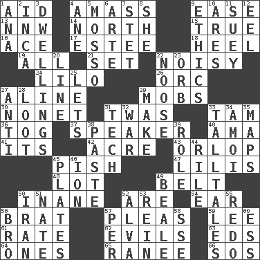 ACROSS 1. Assist 4. Collect or gather 9. Comfort 13. Compass dir. 14. _ pole 15. Loyal 16. Adept person 17. First name in cosmetics 18. Person who is morally reprehensible 19. 100% 21. Put into a specified state 22. Annoyingly loud 24. _ and Stitch 26. The grampus (Milton) 27. Place in a line 29. Crowds into 30. Music written for nine 31. It was, poetically 33. Scottish cap 36. Coat; cloak 37. Orator 40. Nanny (var.) 41. It is 42. Measure of real estate 43. Lowest deck of a ship 45. Expression of disdain 47. Ms. Damita and namesakes 48. Car dealer's back yard 49. Waist strap 50. Silly 52. "We ___ not amused" (Victoria) 54. Ewer handle 56. Naughty child 57. Entreaties 59. Area sheltered from the wind 61. Assign a rank or rating to 62. Vices 63. Begley and Asner 64. Washington bills 65. Indian princess (variant) 66. Distress signal DOWN 1. Santa ___, CA 2. South American Indian 3. Homes 4. A saturated hydrocarbon 5. With motion or animation 6. Johnson of "Laugh-In" 7. Proofreading order 8. A female animal or person 9. Value system 10. Ancient Greek god of war 11. Chop _ 12. Snakelike fish 20. Actor's bit 22. Trap for birds or small mammals 23. Globe 25. Allows 27. Opposed to 28. Plunder 29. Cause to be 31. Technical work 32. Armed conflict 33. Baron Munchausen's specialties 34. Mine, in Marseilles 35. Atlas contents 38. Thick mixture 39. Hero or heavy, e.g. 44. Cause heat under the collar 45. Food holders 46. Electrically charged atom 49. Calif. Air Force Base 50. SW Asia republic 51. Nathan's nickname 52. Inventor's middle name 53. It's straight from the horse's mouth 55. Redecorate 56. Sis' sibling 57. For each 58. Compass dir. 60. Double-curved letter