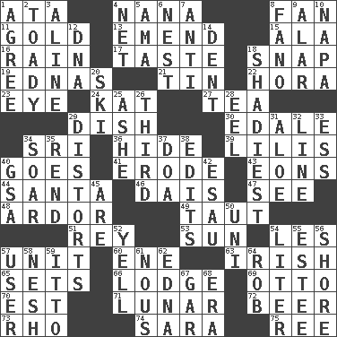 ACROSS 1. _ moment's notice (2 wds.) 4. Nanny 8. Air blower 11. Aureate 13. Make improvements or corrections to 15. According to 16. Water falling in drops from the sky 17. Clothes sense 18. Fastener 19. Ferber et al. 21. Metal container 22. Israeli folk dance 23. Sight organ 24. Krazy ___ of comics 27. Beverage made from leaves 29. Food container 30. Peak District village in England 34. _ Lanka 36. Flintstone garb 39. Ms. Damita and namesakes 40. Travels 41. Wear away 43. Immeasurably long periods of time 44. Before Barbara or Clara 46. Raised platform 47. Perceive with the eye 48. Zeal 49. Drawn tight 51. Marina Del _, California 53. Player for Phoenix 54. French article 57. A single undivided whole 60. Compass dir. 63. From or relating to Ireland 65. Puts into a specified state 66. Cabin 69. "Beetle Bailey" pooch 70. Eastern Standard Time (abbr.) 71. Type of eclipse 72. Fermented drink made from hops 73. 17th letter of the Greek alphabet 74. "Two Mules for Sister ____" 75. To riddle DOWN 1. Match 2. Sycophant 3. Place in a line 4. Fish or hair follower 5. Nanny (var.) 6. Egg locale 7. Opposed to 8. Papal veil 9. Having or resembling wings 10. California wine valley 12. Heredity factor (abbr.) 14. Gouge 18. Most dubious of character or honesty 20. What Jean-Claude Killy likes to do 25. American tennis player Robert 26. One of three equal parts 28. Snakelike fish 29. What propaganda does 31. Medicinal plant 32. Actor's bit 33. Double-curved letter 34. Fly high 35. Tear apart 37. ___ good deed 38. Proofreads 40. Girls' org. (abbr.) 42. Son of Isaac 45. "We ___ not amused" (Victoria) 50. University (slang) 52. Shout 54. 61 cubic inches 55. First name in cosmetics 56. Dinah or Pauly 57. One who uses or employs something 58. Tender 59. "Tell ____ the Marines!" 61. Common sense 62. Pulitzer Prize-winning author Ferber 64. Director Reiner 67. Slender fish 68. Period