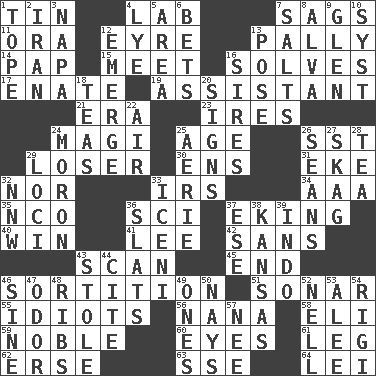 ACROSS 1. Shallow baking pan 4. Experiment locale 7. Sinks 11. Mouth or opening 12. Jane of fiction 13. Friendly 14. Infant food 15. Confront 16. Finds the solution 17. Maternal 19. Aide 21. Epoch 23. Angers 24. Wise men 25. Ripen 26. Fast jet (abbr.) 29. Failure 30. Followers of ems 31. Supplement with great effort 32. And not 33. Big collection agency 34. Auto club (abbr.) 35. Non-commissioned officer (abbr.) 36. _-fi 37. Supplementing with great effort 40. Victory 41. Area sheltered from the wind 42. Without 43. Skim 45. Conclusion 46. Drawing lots 51. Underwater navigation system 55. Foolish or stupid persons 56. Nanny 58. Biblical high priest 59. Having high moral qualities 60. Snake ____ (dice throw) 61. Part of a journey 62. Celtic language 63. Compass dir. 64. Luau accessory DOWN 1. Drink excessively 2. SW Asia republic 3. California wine valley 4. Sodium hydroxide 5. Type of rug 6. Antes 7. Table seasonings 8. Inventor's middle name 9. Small, secluded valley 10. System (abbr.) 12. Develop 13. Airs 16. Titles for men of rank and authority 18. Beverages made from leaves 20. Omens 22. Wind 24. Person of subnormal intelligence 25. Nest on high 26. Actors Connery and Penn 27. Heroin 28. Afternoon social gathering 29. Venues 32. Compass dir. 33. Ancient Celtic tribe of eastern Britain 36. Narrow boards 37. Compass dir. 38. Sunflower state 39. Southeast Asian peninsula 43. Fur scarf 44. Quote 46. Trig term 47. Aroma 48. Teases 49. Washington bills 50. Negative votes 52. 1994 drama film starring Jodie Foster 53. Toward shelter 54. Swiss mountan, "Queen of the Mountains" 57. Born