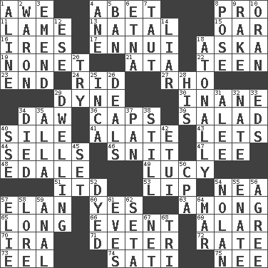 ACROSS 1. Deep reverence 4. Collude with 8. Adept person 11. Unable to walk 13. Brizilian seaport 15. Boat paddle 16. Angers 17. World-weariness 18. "____ silly question..." 19. Music written for nine 21. "One Day ___ Time" 22. Adolescent 23. Conclude 24. To free from 27. 17th letter of the Greek alphabet 29. Centimeter-gram-second unit of force 30. Empty; void 34. Obsolete 36. Smile enhancers 39. First course 40. Drop; flow; fall 41. Having winglike extensions 43. Allows 44. Exchanges for money 46. In a ____ (agitated or irritated) 47. Area sheltered from the wind 48. Peak District village in England 49. "I Love _" 51. It would 53. Mouth edge 54. Teachers' org. 57. Flair 60. Consenting reply 63. Amid 65. Yearn 66. Incident 69. Having or resembling wings 70. Lyricist Gershwin 71. Prevent from occurring 72. Pace 73. Snakelike fish 74. Suttee (variant) 75. Born DOWN 1. Place in a line 2. Make _____ (do battle with) 3. Make improvements or corrections to 4. One (Scot) 5. Prohibit 6. Inactive volcano in Sicily 7. Strained 8. Airs 9. Libertine 10. NW Algerian seaport 12. Compass dir. 14. One who doesn't tell the truth 18. Lacking a tonal center or key 20. Attempt to accomplish something 25. South American Indian 26. Allots cards 28. Part of HMS, perhaps 29. Home 31. Toward shelter 32. Nathan's nickname 33. Begley and Asner 34. Passed on 35. Silent film actress Nazimova 37. Baking dish 38. Not moving 40. Compass dir. 42. Needle holder 45. Arrange properly for use 50. Accounting whiz (abbr.) 52. Colored 54. Pitcher Ryan 55. Related on the mother's side 56. Match 57. Writer Wiesel 58. Old wives' tales, e.g. 59. Of or related to the anus 61. Nights before holidays 62. Bristle 64. Spoil 67. Remaining after all deductions 68. Three (prefix)