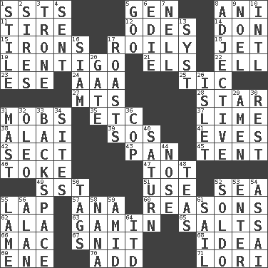 ACROSS 1. Fast planes 5. Commissioned military rank (abbr.) 8. Black tropical American cuckoo 11. Hoop that covers a wheel 12. Lyric poems 14. Spanish title 15. Removes the wrinkles 17. Agitated, as a liquid 18. Passenger plane 19. Small, flat, pigmented spot on the skin 21. Raised railways 22. Pipe bend 23. Compass dir. 24. American Automobile Association (abbr.) 25. Nervous spasm 27. Mountains (abbr.) 28. Play the lead 31. Disorderly crowds 35. And so on (abbr.) 37. Citrus frut 38. Mountain range southwest of Kyrgyzstan 39. Mayday 41. Nights before holidays 42. Religious group 43. Baking dish 45. Portable shelter 46. Puff or smoke 47. Small child 49. Fast jet (abbr.) 51. Purpose 52. Ocean 55. Infant locale 57. Santa ___, CA 60. Thinks logically 62. According to 63. Homeless child 65. Table seasonings 66. Big _ 67. In a ____ (agitated or irritated) 68. It may be bright or harebrained 69. Compass dir. 70. Increase 71. Australian parrot (variant) DOWN 1. Vertical member of a panel or frame 2. Titles for men of rank and authority 3. Heavy duty weighing machine 4. Transmitted 5. Thick or sticky substance 6. Singer Brickell 7. 1994 drama film starring Jodie Foster 8. Descriptive word 9. Christmas carol 10. International (abbr.) 13. System (abbr.) 16. Thailand, formerly 17. Exposes to great heat 20. Yard entry 26. Small island 29. So be it 30. Repose 31. Vertical spar for supporting sails 32. Butter sub 33. Keyboard key 34. Locates 36. Police officer (slang) 40. Titan orbits this 44. Sense of smell 48. Beverages made from leaves 50. Labels 52. Twentieth part of a lira 53. Keyboard key 54. Slender Brazilian palm 55. Unable to walk 56. Actor Alda or Thicke 58. Grandmother 59. Among 61. Travel by water 64. It would