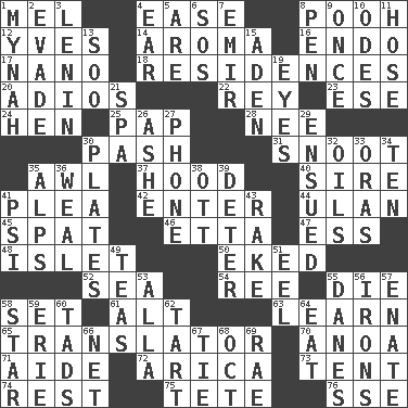 ACROSS 1. Cartoonist voice _ Blanc 4. Comfort 8. "Silly old bear" 12. Jacques Cousteau's middle name 14. Odor 16. Inside; within (prefix) 17. Billionth: prefix 18. Dwellings 20. Goodbye (Sp.) 22. Marina Del _, California 23. Compass dir. 24. Layer 25. Infant food 28. Born 30. Romantic infatuation 31. Snout, nose 35. Leather borer 37. Parka part 40. The founder of a family 41. Entreaty 42. Keyboard key 44. ____ Bator, Mongolia 45. Argument over a trivial matter 46. Singer James 47. Curvy letter 48. Small island 50. Supplemented with great effort 52. Ocean 54. To riddle 55. Expire 58. Put into a specified state 61. Keyboard modifier key 63. Memorize 65. Interpreter 70. Small Philippine buffalo 71. Helper 72. N. Chile seaport 73. Portable shelter 74. Repose 75. Wig 76. Compass dir. DOWN 1. Non-adult bird? 2. Elude 3. Soviet premier 1918-24 4. Hearing organ 5. "We ___ not amused" (Victoria) 6. Distress signal 7. Independent ruler or chieftain 8. Fenced enclosure 9. Single time 10. Lyric poems 11. Stockings 13. "Barney Miller" actor Jack 15. An important port of Yemen 19. Snake ____ (dice throw) 21. Health resort 26. American tennis player Robert 27. Give a jingle 29. Took place subsequently 30. Food holders 32. Petroleums 33. Mouths or openings 34. Nine, plus one 35. High mountains 36. Welt 38. Baseball player Mel 39. Prevent from occurring 41. 23rd letter of the Greek alphabet 43. Immoral or dissolute person 49. Beverages made from leaves 51. Snakelike fish 53. Silent film actress Nazimova 55. Natives or inhabitants of Denmark 56. Metal shackles 57. Related on the mother's side 58. Play the lead 59. 4th largest of the Great Lakes 60. Small boys 62. Small pie 64. Consume 66. Fish or hair follower 67. Neckwear 68. Sep. follower 69. Actress Charlotte