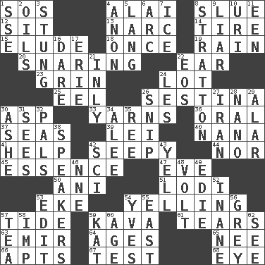ACROSS 1. Distress signal 4. Jai ____ 8. Change direction abruptly 12. Be seated 13. Drug cop 14. Hoop that covers a wheel 15. Dodge 18. Single time 19. Precipitation 20. Catching in a trap 22. Ewer handle 23. Amused look 24. Car dealer's back yard 25. Snakelike fish 26. French poetic form 30. Viper 33. Tall tales 36. Taken by mouth 37. Oceans 39. Luau accessory 40. Grandmother 41. Aid 42. Oozy 44. And not 45. Center 47. First lady 50. Black tropical American cuckoo 51. Farming town in central California 53. Make supply last 54. Crying or shouting loudly 57. Event that recurs at intervals 59. Polynesian shrub of the pepper family 61. Lacerates 63. Arab leader 64. Matures 65. Born 66. Flats, for short 67. Trial 68. Sight organ DOWN 1. Compass dir. 2. Petroleums 3. Feeling sharp psychological pain 4. At once, immediately (arch.) 5. Austrian-born American filmmaker Fritz 6. Curve 7. Frozen water 8. Ski resort town in Vermont 9. One who doesn't tell the truth 10. RI univ. 11. Car or cant ending 16. Have the gumption 17. 4th largest of the Great Lakes 21. Inwardly 22. Greek goddess of the dawn 24. French article 26. Sever or remove by pinching or nipping 27. SW Asia republic 28. Billionth: prefix 29. Having or resembling wings 30. American tennis player Robert 31. Perceives with the eye 32. Friends 34. Toward shelter 35. To riddle 38. Orators 42. _-fi 43. Shout 46. Compass dir. 48. Electrical Unit 49. Singer Brickell 52. Empty; void 53. Prepare for publication 54. Jacques Cousteau's middle name 55. 90 degrees 56. Jennifer or Joel 57. Beverage made from leaves 58. Naughty child 59. Krazy ___ of comics 60. Ripen 62. Perceive with the eye