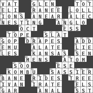 ACROSS 1. Large container 4. Small, secluded valley 8. Small child 11. Connecticut Ivy Leaguer 12. The wife of a rajah (variant) 14. Hang loosely or laxly 15. Charged atoms 17. Approach 18. Actor Baldwin 19. Snuggling 21. White American of non-Hispanic descent 23. Sep. follower 24. Double-curved letter 25. Drink excessively 27. Narrow board 30. Republican Party 31. Window treatments 34. Increase 37. Australian flightless bird 38. Having winglike extensions 39. Falsehood 40. French article 41. Sunflower state 43. Elected rep. 44. Not women's 45. Tiny particle 47. "Barney Miller" actor Jack 49. Compass dir. 50. Dried seaweed eaten as food 52. More impudent 56. Object of repulsion 57. Amusement-park features 60. Relationship diagram 61. "Terrible" tsar 62. Feeling or showing extreme anger 63. Raised railways 64. Slender fish 65. Of or related to the anus 66. Fast jet (abbr.) DOWN 1. Distinctive style or manner 2. Medicinal plant 3. Metal containers 4. Monetary aid 5. Austrian-born American filmmaker Fritz 6. Compass dir. 7. Teachers' org. 8. For Whom the Bell _____ 9. Butter sub 10. Affectionate concern, for short 13. Epoch 14. Fails to keep up a pace 16. Cease 20. On the rocks 22. Fish or hair follower 25. Heavy book 26. Musical composition 27. Connects, as a bridge 28. Allows 29. Toward the sea 30. Set 32. Immoral or dissolute person 33. Actor Alda or Thicke 34. In addition 35. South Vietnam president (1954) 36. Lair 42. Backtalk 44. Crowd into 46. Trial 47. Echolocation 48. Sign of something about to happen 49. Artist's stand 50. Polynesian shrub of the pepper family 51. RI univ. 52. Stalk of a moss capsule 53. Angers 54. Snakelike fish 55. Respite 56. Of large size 58. Lyricist Gershwin 59. Daniel's nick name