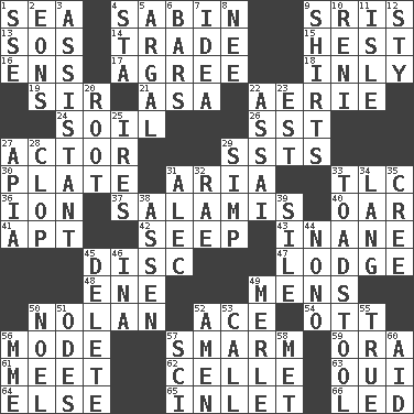 ACROSS 1. Ocean 4. Unit of acoustic absorption 9. Indian titles of respect 13. Distress signal 14. Exchange 15. Command 16. Followers of ems 17. Match 18. In an inward manner 19. Title for a knight 21. White ___ sheet 22. Nest on high 24. Earth 26. Fast jet (abbr.) 27. Thespian 29. Fast planes 30. Food holder 31. Roberta Peters solo 33. Affectionate concern, for short 36. Electrically charged atom 37. Deli grouping 40. Boat paddle 41. Fitting 42. Ooze 43. Lacking in sense or substance 45. Flat circle 47. Cabin 48. Compass dir. 49. Not women's 50. Pitcher Ryan 52. Adept person 54. Baseball player Mel 56. Method 57. Excessive but superficial compliments 59. Mouth or opening 61. Confront 62. Cell (Danish) 63. Fr. "Yes" 64. Otherwise 65. An arm off of a larger body of water 66. Directed DOWN 1. Compass dir. 2. Immeasurably long periods of time 3. Aide 4. R.R. building 5. Therefore, facetiously 6. Soap units 7. The content of cognition 8. Born 9. Upper-body garments 10. Painter Guido (1575-1642) 11. Capri or Wight 12. Filthy place 20. Carrot, for example 22. Slender Brazilian palm 23. Eastern Standard Time (abbr.) 25. Angers 27. Capital of Western Samoa 28. Hoof sound 29. Simple or foolish person 31. Actor Baldwin 32. Actress Charlotte 33. Inedible or poisonous agaric 34. Long (Scottish) 35. Algonquian 38. NE Netherlands city 39. Drop; flow; fall 44. Words to Nanette 45. Keyboard key 46. _ tizzy (2 wds.) 49. Haggard of country music 50. Christmas carol 51. Lyric poems 52. So be it 53. Give a ring to 55. Loyal 56. Madame (abbr.) 57. _-fi 58. Was introduced to 60. Assist