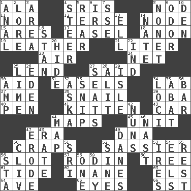 ACROSS 1. According to 4. Indian titles of respect 8. Lower and raise head in agreement 11. Not either 12. Laconic 14. Thickened enlargement 15. Ancient Greek god of war 17. Artist's stand 18. Soon (poet.) 19. Cordwainer's material 21. 61 cubic inches 23. Atmosphere 24. Remaining after all deductions 25. Grant temporary use of 27. Expressed in words 30. Help 31. Artist's stands 34. Experiment locale 37. Madame (abbr.) 38. Slow-paced one 39. Chief or king in Benin or Nigeria 40. Writing instrument 41. Baby cat 43. 4-wheeled motor vehicle 44. Atlas contents 45. A single undivided whole 47. Period 49. Heredity factor (abbr.) 50. Dice game 52. More lively and spirited 56. Narrow opening 57. "The Thinker" sculptor 60. Relationship diagram 61. Event that recurs at intervals 62. Silly 63. Raised railways 64. "___ Maria" 65. Sight organs 66. Fast jet (abbr.) DOWN 1. Of or related to the anus 2. Old wives' tales, e.g. 3. Length times width 4. Guide 5. Bring up, as a child 6. Big collection agency 7. Compass dir. 8. Music written for nine 9. Aroma 10. Lair 13. Pipe bend 14. Nathan's nickname 16. Comedian Laurel of Laurel & Hardy 20. Flintstone garb 22. Indiana (abbr.) 25. Citrus frut 26. Locale of original sin 27. Theater features 28. Set down 29. Capri or Wight 30. Electrical Unit 32. "____ silly question..." 33. Sever or remove by pinching or nipping 34. Locales 35. Blind as ____ 36. Drinking establishment 42. Religious women 44. Atlas unit 46. Political cartoonist Thomas 47. Eat (away) 48. Pace 49. Natives or inhabitants of Denmark 50. 154 in Roman numerals 51. Indian title of respect (Mr.) 52. Trig term 53. Angers 54. Snakelike fish 55. Remainder 56. R.R. building 58. Single 59. 24 hours