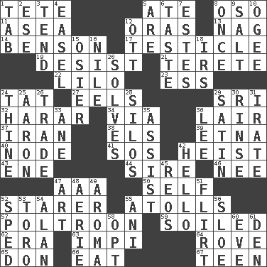 ACROSS 1. False hair 5. Had dinner 8. Bear (Spanish) 11. At sea 12. Mouths or openings 13. Tired old horse 14. Gillaume's butler role 17. A testis 19. Cease 21. Cylindrical with tapered ends 22. _ and Stitch 23. Double-curved letter 24. Make lace 27. Snakelike fish 29. _ Lanka 32. Ethiopian city, capital of Harari 34. By way of 36. Den 37. SW Asia republic 38. Raised railways 39. Inactive volcano in Sicily 40. Connecting point 41. Mayday 42. Robbery 43. Compass dir. 44. The founder of a family 46. Born 47. Auto club (abbr.) 50. Itself 52. A viewer who gazes fixedly 55. Ringlike coral islands and reefs 57. Characterized by complete cowardliness 59. Dirtied 62. Period 63. Body of Kaffir warriors 64. Be footloose 65. Spanish title 66. Consume 67. Adolescent DOWN 1. Keyboard key 2. Compass dir. 3. Look after 4. Artist's stand 5. "We ___ not amused" (Victoria) 6. Clothes sense 7. _____ Park, CO 8. Single time 9. Table seasoning 10. Double curve, resembling the letter S 12. Baseball player Mel 15. Flexible twig of a willow tree 16. "Death on the ____" 18. Big collection agency 20. Finds the solution 24. One or ones belonging to thee 25. Composer Copland 26. Buy and sell 28. Grain storage towers 29. Smooth fabric 30. Wash lightly 31. Feeling or showing extreme anger 33. A saturated hydrocarbon 35. Help 36. Area sheltered from the wind 42. Phone greeting 45. Vintage cars 47. Nonscientific branch of learning 48. Nest on high 49. Odor 51. Talk or behave amorously 52. Broke a traffic law 53. "Corrida" creature 54. Actor Alda or Thicke 55. Black tropical American cuckoo 56. _ gin 58. Choose 60. Night before a holiday 61. Lair