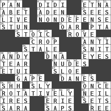 ACROSS 1. Baking dish 4. "You Light Up My Life" star Conn 8. Inactive volcano in Sicily 12. Collude with 14. Arabian gulf 15. Perceives with the eye 16. Moving, as bait 17. Unrelated to defense, as in spending 20. Make senseless or dizzy 21. Boat paddle 22. Parent Teacher Association (abbr.) 23. Unemotional 27. Be footloose 29. Riding implement 31. Opposed to 34. Lacking originality or spontaneity 35. In a ____ (agitated or irritated) 36. Actor Griffith 39. Heredity factor (abbr.) 41. Sight organs 42. Pull into pieces 43. Unadorned figures 46. Needle holder 47. A type of plum 48. Open wide 51. Natives or inhabitants of Denmark 54. Quiet! 56. Stealthy 58. Single time 61. Producing rotation 66. Famous astronaut Armstrong 67. Angers 68. 4th largest of the Great Lakes 69. Puts into a specified state 70. "Two Mules for Sister ____" 71. Plant excrements 72. Portuguese money of account (variant) DOWN 1. Friends 2. "This won't hurt ____!" 3. Congenital growth or mark on the skin 4. One of the 12 tribes of Israel 5. Wedding promise 6. Lair 7. _ china 8. Compass dir. 9. 3-inch nail 10. Egg locale 11. Toward the sea 13. Portable shelter 18. Ewer handle 19. Back 24. Sep. follower 25. Lyricist Gershwin 26. Having a low temperature 28. Flower holders 30. Actor Sean's family 32. Standoff 33. ___ a Wonderful Life 34. Damascus' land 36. Had dinner 37. Remaining after all deductions 38. Female offspring 40. Old (Scot.) 44. ___ good deed 45. Car or cant ending 49. Pacific Standard Time (abbr.) 50. Biblical high priest 52. Immeasurably long periods of time 53. Contemptuous expression 54. Indian titles of respect 55. Israeli folk dance 57. Jacques Cousteau's middle name 59. Quote 60. Otherwise 62. White ___ sheet 63. Period 64. Mouth edge 65. Consenting reply
