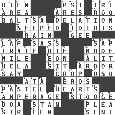 ACROSS 1. South Vietnam president (1954) 5. Pacific Standard Time (abbr.) 8. Three (prefix) 11. Type of rug 12. Ancient Greek god of war 13. Friend of Pooh 14. Greek mezzo-soprano Agnes 17. Accusation by an informer 19. Oozed 21. Foolish or stupid persons 22. Water falling in drops from the sky 23. Unit of force equal to gravity 24. Infant locale 27. Backtalk 29. Plant excrement 32. Feeling or showing extreme anger 34. Shoshoni 36. Method 37. The longest river in the world 38. Period of immesurable duration 39. Came down and settled, as after flight 40. Southern CA. univ. 41. Be seated 42. Zeal 43. Declare 44. Riding implement 46. Bear (Spanish) 47. _ moment's notice (2 wds.) 50. Greek god of love 52. Soft color 55. Centers 57. Electrical Measurement 59. Moe Howard, for one 62. ___ good deed 63. Comedian Laurel of Laurel & Hardy 64. Entreaty 65. Title for a knight 66. Car or cant ending 67. Emitted DOWN 1. Apply (a substance) by light strokes 2. Lyricist Gershwin 3. Snakelike fish 4. Mother 5. Before (prefix) 6. Former Milwaukee Brewers owner Bud 7. Sadhe (variant) 8. Musical group of three 9. Carrot, for example 10. Charged atoms 12. Say or write further 15. Gospel singer Marvin 16. Capital of Western Samoa 18. Neckwear 20. Takes place subsequently 24. "_ and Lucy" (Charlie Brown theme song) 25. N. Chile seaport 26. Friendly 28. Unemotional 29. Twentieth part of a lira 30. Goodbye (Sp.) 31. Stone: prefix 33. Beverage made from leaves 35. Main course 36. Make imperfect 42. To the left, to Queeg 45. Mouths or openings 47. Had dinner 48. Laconic 49. Having winglike extensions 51. Discontinues 52. Groovy apts. 53. Mine, in Marseilles 54. Coast Guard woman 55. Layer 56. Not divided or shared with others 58. Separate the seeds from cotton 60. Commissioned military rank (abbr.) 61. Ingest