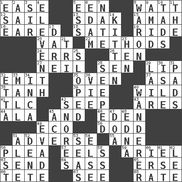 ACROSS 1. Comfort 5. Car or cant ending 8. Electrical Unit 12. Move on water 13. Neighbor of Neb. 15. Wet nurse 16. Having ears or earlike features 18. Suttee (variant) 19. Travel on or in a vehicle 20. Large container 22. Modes 24. Blunders 26. Nine, plus one 27. Famous astronaut Armstrong 28. Elected rep. 29. Mouth edge 32. Send forth 35. Baking chamber 37. White ___ sheet 38. Hyperbolic tangent 39. Sliced dessert 40. Uncontrolled 41. Affectionate concern, for short 42. Ooze 43. Ancient Greek god of war 44. Insect wing 45. Plus 46. Genesis locale 49. Environmental prefix 50. Texas town _ City 51. Contrary to your interests or welfare 55. One (Scot) 56. Entreaty 57. Snakelike fish 59. Satellite of Uranus 63. Post 64. Backtalk 65. Celtic language 66. Wig 67. Perceive with the eye 68. Assign a rank or rating to DOWN 1. Compass dir. 2. American Automobile Association (abbr.) 3. Title for a knight 4. Veterans Day date 5. Curvy letter 6. Dutch treat 7. Nathan's nickname 8. Make _____ (do battle with) 9. Among 10. Bits 11. Definite Article 14. Baby cat 17. Have the gumption 21. Three (prefix) 23. Layer 25. Inclined 28. Oozed 29. Den 30. Capri or Wight 31. Groovy apts. 32. Singer James 33. Shopping center 34. South American Indian 36. Compete 40. Roamer 42. Sounds asleep 45. Adept person 47. ___ good deed 48. Pulitzer Prize-winning author Ferber 49. Elude 51. Toward shelter 52. Undesirable depression on a surface 53. Oceans 54. Otherwise 56. Pacific Standard Time (abbr.) 58. Compass dir. 60. Lyricist Gershwin 61. Eastern Standard Time (abbr.) 62. Area sheltered from the wind