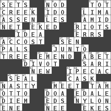 ACROSS 1. Puts into a specified state 5. Dreamland 8. Small child 11. Small stream 13. Wedding promise 14. Pale green bean 15. NE Netherlands city 16. French article 17. Among 18. Fish or hair follower 19. Supplemented with great effort 21. Debaucheries 22. It may be bright or harebrained 24. Blunders 25. Buttonhole 27. Elected rep. 29. Friends 30. Secret group 32. Relationship diagram 33. Make improvements or corrections to 35. Collude with 39. A piece of turf (Scot.) 41. Indian skirt 42. ___ Haven, CT 43. Medicinal drug used to evoke vomiting 45. Lick closed 48. Keg 49. Difficult 50. Rendezvous 52. Scottish cap 55. "Beetle Bailey" pooch 56. ___ good deed 57. Peak District village in England 59. South Vietnam president (1954) 60. Begley and Asner 61. Thermoplastic polyamide 62. Compass dir. 63. Born 64. Makes supply last DOWN 1. Skim 2. Celtic language 3. A testis 4. Observe 5. Mediterranean tributary 6. Wrote a lyric poem 7. Two (Sp.) 8. The easternmost of the Lesser Sundas 9. Leaves out 10. Bits 12. Leg joints 14. Den 20. Krazy ___ of comics 21. Monthly bill 23. Administered medicine 25. Fitting 26. Automobile 27. Player for Phoenix 28. Conclude 30. _ stream 31. Fertile tracts in a desert 33. First lady 34. Cut the grass 36. Sass 37. Epoch 38. Nervous spasm 40. Inwardly 43. Frozen water 44. Eucharist need 45. Smooth fabric 46. First name in cosmetics 47. Smallest unit of an element 49. Thickened enlargement 50. Method 51. Comfort 53. Medicinal plant 54. Not women's 56. Lair 58. Color