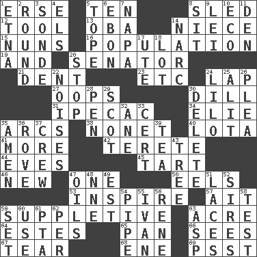 ACROSS 1. Celtic language 5. "___ Little Indians" 8. Downhill vehicle 12. Implement 13. Chief or king in Benin or Nigeria 14. Sibling's daughter 15. Religious women 16. Census information 19. Plus 20. Elected representative 21. Gouge 23. And so on (abbr.) 24. Infant locale 27. I made a mistake 30. Deli pickle 31. Medicinal drug used to evoke vomiting 34. Writer Wiesel 35. Curves 38. Music written for nine 40. Globular water bottle used in Asia 41. Greater amount 42. Cylindrical with tapered ends 44. Nights before holidays 45. Small pie 46. ___ Haven, CT 47. Single 50. Snakelike fish 53. Stimulate to action 57. Small island 59. Supplying deficiencies 63. 1/640 square mile 64. _____ Park, CO 65. Baking dish 66. Observes 67. Separate forcefully 68. Compass dir. 69. Inconspicuous attention getter DOWN 1. Inactive volcano in Sicily 2. Unit of ammunition 3. Message 4. Raised railways 5. Drink excessively 6. Inky black, to poets 7. California wine valley 8. Be seated 9. Flowery wreath 10. Environmental prefix 11. Lair 14. Drug cop 17. Shoshoni 18. Car dealer's back yard 20. Discontinue 22. Annoying sounds 24. _ and Stitch 25. Came down and settled, as after flight 26. Entreaty 28. Writing instrument 29. Highlander 30. Erase 32. One (Scot) 33. An absolute certainty 35. So be it 36. Be footloose 37. Ship's personnel 39. Afternoon social gathering 43. Relationship diagram 47. Lubricates 48. Compass dir. 49. Eastern Standard Time (abbr.) 51. Shoestrings 52. Male parents of animals 54. Corncob 55. "Terrible" tsar 56. French philosopher Descartes 58. Trial 59. Arrange properly for use 60. Purpose 61. Parent Teacher Association (abbr.) 62. For each 63. Viper