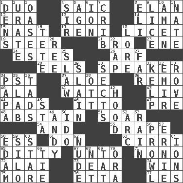 ACROSS 1. Superhero pair 4. Ketch in the Levant 8. Style 12. Period 13. Russian composer Stravinsky 14. Pale green bean 15. Political cartoonist Thomas 17. Painter Guido (1575-1642) 18. It is permitted: Lat. 19. Guide 21. Sis' sibling 23. Compass dir. 24. _____ Park, CO 26. Sandy's bark 28. Snakelike fish 30. Orator 34. Pacific Standard Time (abbr.) 37. Medicinal plant 39. San ____ (Riviera town) 40. Insect wing 41. Timepiece 43. 54 in ancient Rome 44. Groovy apts. 46. "Tell ____ the Marines!" 47. Before (prefix) 48. Refrain by choice 51. Fly high 54. Plus 55. Window treatment 58. Curvy letter 61. Spanish title 63. High-altitude cloud 65. Simple song 67. To (old English) 71. Words to Nanette 72. Jai _ 73. Letter starter 74. Victory 75. Greater amount 76. Singer James 77. French article DOWN 1. Habitations of wild animals 2. A salt of uric acid 3. Fertile tracts in a desert 4. Title for a knight 5. Ripen 6. Electrically charged atom 7. Baby bed with high sides 8. Connecticut Ivy Leaguer 9. Louse (plural) 10. So be it 11. Nathan's nickname 16. Wig 18. Old wives' tales, e.g. 20. To sift 22. Hit sharply and swiftly 25. Cole _ (cabbage dish) 27. At a great distance 29. Killed 30. Religious groups 31. Seaweed 32. Arab leader 33. Be footloose 34. Dad 35. Broad, flat, thick piece 36. Small amounts or degrees 38. Baseball player Mel 42. Parka part 45. R.R. building 49. Actor Griffith 50. Wedding promise 52. Curve 53. Water falling in drops from the sky 56. Move like a hungry wolf 57. Bert's buddy 58. Dutch treat 59. Grain storage tower 60. Play the lead 62. Naked 64. Charged atoms 66. Make a knot 68. Remaining after all deductions 69. Make lace 70. Mouth or opening
