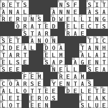ACROSS 1. Stakes 5. Science/research agcy. 8. Be seated 11. Of or related to the anus 12. Queen of England 1702-14 13. White ___ sheet 14. Summer TV shows 17. Residence 19. Declaimed 21. Opts 22. Play the lead 23. Actress Charlotte 24. Put into a specified state 27. At once, immediately (arch.) 29. Nervous spasm 32. Standard of perfection 34. ___ good deed 36. Hyperbolic tangent 37. Small pie 38. Shade tree 39. Jai ____ 40. Otherwise 41. Plant excrement 42. Representative 43. Observe 44. 1994 drama film starring Jodie Foster 46. Ocean 47. Opposite of masc. 50. 480, 500 or 516 sheets of paper 52. Unrefined 55. Gossips 57. One to whom something is allotted 59. Keyboard key 62. Luau accessory 63. Greek god of love 64. Path through which fluid escapes 65. Car dealer's back yard 66. Car or cant ending 67. Change direction abruptly DOWN 1. Soap unit 2. Compass dir. 3. Pacific island yam 4. Plays smoothly or legato 5. Compass dir. 6. Contemptuous expression 7. Chap (slang) 8. Ketch in the Levant 9. Is not 10. Labels 12. Find the sum of 15. Brizilian seaport 16. Comedian Laurel of Laurel & Hardy 18. Area sheltered from the wind 20. Eats (away) 24. Locates 25. Peak District village in England 26. Laconic 28. Pitcher Ryan 29. Stories 30. Empty; void 31. Riviera of "Kiss of the Spider Woman" 33. Had dinner 35. Electrical Unit 36. Label 42. Having winglike extensions 45. Grant temporary use of 47. Back 48. First name in cosmetics 49. Distance measurement (Brit.) 51. Promenades 52. Give a ring to 53. Butter sub 54. Set down 55. Consenting reply 56. Sew up the eyelids of hawks and falcons 58. Period of immesurable duration 60. The 19th letter of the Greek alphabet 61. Make supply last