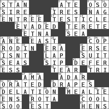 ACROSS 1. Comedian Laurel of Laurel & Hardy 5. Had dinner 8. Bear (Spanish) 11. Male parent of an animal 12. Angers 13. Tired old horse 14. Main course 17. A testis 19. Eluded 21. Cigar-shaped 22. Inactive volcano in Sicily 23. Ocean 24. One (Scot) 27. Compass direction 29. Police officer (slang) 32. "The Thinker" sculptor 34. Epoch 36. Celtic language 37. Is not 38. Pet locale 39. Set of matching outer garments 40. Oceans 41. Small drink 42. Put off 43. Curvy letter 44. Pull into pieces 46. Three (prefix) 47. Nanny (var.) 50. The sixth month of the Jewish calendar 52. Declaimed 55. Window treatments 57. Conveyance 59. Ear of corn 62. Followers of ems 63. Round or rotation of duties 64. Calm and collected 65. "Barney Miller" actor Jack 66. Eastern Standard Time (abbr.) 67. Coop moms DOWN 1. Compass dir. 2. Shallow baking pan 3. Johnson of "Laugh-In" 4. Impudent aggressiveness 5. "We ___ not amused" (Victoria) 6. Trials 7. First name in cosmetics 8. At one time in the past 9. Table seasoning 10. Double curve, resembling the letter S 12. It would 15. Consumed 16. Pulitzer Prize-winning author Ferber 18. Retirement account (abbr.) 20. Artist's stands 24. Originate 25. Olfactory organs 26. Ferber et al. 28. Distinguishing feature 29. An unpleasant substance 30. Flexible twig of a willow tree 31. _ dish (used to culture cells) 33. It is 35. Seem 36. Compass dir. 42. Window treatment 45. First of billions? 47. "One Day ___ Time" 48. Distance measurement (Brit.) 49. Goodbye (Sp.) 51. Arrive at 52. Lyric poems 53. Former U.S. Attorney General Janet 54. In addition 55. Heredity factor (abbr.) 56. _ gin 58. Baseball player Mel 60. Electrically charged atom 61. Raised railways