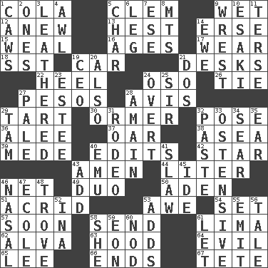 ACROSS 1. Root beer relative 5. Clement's nick name 9. Soggy 12. Afresh 13. Behest 14. Celtic language 15. Welt 16. Grows older 17. Erode 18. Fast jet (abbr.) 19. Automobile 21. Writing tables 22. The bottom of a shoe or boot 24. Bear (Spanish) 26. Standoff 27. Mexican monetary units 28. Deliberation 29. Small pie 30. Abalone 32. Introduce or present, as a question 36. Toward shelter 37. Boat paddle 38. Toward the sea 39. Ancient Persian 40. Prepares for publication 42. Play the lead 43. So be it 44. 61 cubic inches 46. Fish or hair follower 49. Superhero pair 50. An important port of Yemen 51. Sour-tasting 53. Deep reverence 54. Put into a specified state 57. Within a short period 58. Post 61. Pale green bean 62. Inventor's middle name 63. Parka part 64. Tending to cause great harm 65. Area sheltered from the wind 66. Conclusions 67. Wig DOWN 1. Crow sounds 2. Washington bills 3. Resembling or made to resemble leather 4. Leather borer 5. Burn to charcoal 6. Part of a journey 7. Compass dir. 8. Mountains (abbr.) 9. Obtain by seizing forcibly or violently 10. 1973 Nobel Price Winner (Physics) Leo 11. Laconic 14. She-sheep 19. Corporate head (abbr.) 20. In addition 21. Two (Sp.) 23. First name in cosmetics 24. Unconcealed 25. Title for a knight 27. Light colored 28. At full speed 29. Scottish cap 31. Cowboy competition 32. Thick mixture 33. Clearly or manifestly demonstrative 34. Shrivel 35. Hearing organ 40. Australian flightless bird 41. Cole _ (cabbage dish) 43. Find the sum of 45. Binary compound 46. Rhinal 47. Learning spot: Fr. 48. Collection of objects 52. _ tizzy (2 wds.) 53. Does sums 55. Give off 56. Story 58. A female animal or person 59. A really long time 60. Lower and raise head in agreement 61. Allow