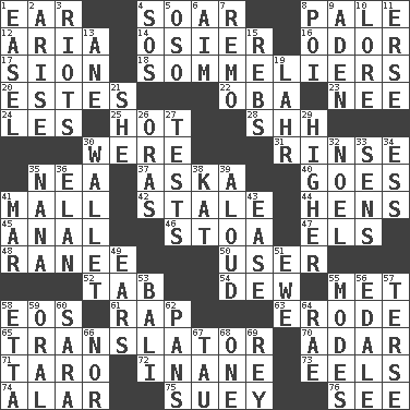 ACROSS 1. Hearing organ 4. Fly high 8. Diluted with white 12. Operatic vocal solo 14. Flexible twig of a willow tree 16. Scent 17. The Jewish people; Israel 18. Wine waiters 20. _____ Park, CO 22. Chief or king in Benin or Nigeria 23. Born 24. French article 25. Being at a high temperature 28. Quiet! 30. We are 31. Wash lightly 35. Teachers' org. 37. "____ silly question..." 40. Travels 41. Shopping center 42. Having lost freshness 44. Coop moms 45. Of or related to the anus 46. Portico 47. Raised railways 48. The wife of a rajah (variant) 50. One who makes use of a thing 52. Keyboard key 54. Morning condensation 55. Was introduced to 58. Greek goddess of the dawn 61. Hit sharply and swiftly 63. Eat (away) 65. Interpreter 70. The sixth month of the Jewish calendar 71. Edible starchy tuberous root 72. Lacking in sense or substance 73. Snakelike fish 74. Having or resembling wings 75. Chop _ 76. Perceive with the eye DOWN 1. Artist's stand 2. Ascend 3. Disturbances 4. Distress signal 5. Bear (Spanish) 6. Direct toward a target or goal 7. San ____ (Riviera town) 8. Luau course 9. An important port of Yemen 10. Old wives' tales, e.g. 11. Celtic language 13. One (Scot) 15. Confederate soldiers (slang) 19. Cowardly lion portrayer 21. A female animal or person 26. Mouths or openings 27. Trials 29. Having greater elevation 30. Place for singles 32. Christmas carol 33. Elected reps. 34. Double-curved letter 35. Nanny 36. Enthusiasm 38. Krazy ___ of comics 39. Verbally 41. Impair 43. Relaxation 49. Hearing organs 51. She-sheep 53. Indonesian resort city 55. Methods 56. Peak District village in England 57. Laconic 58. Singer James 59. Relating to the mouth 60. "Two Mules for Sister ____" 62. Baking dishes 64. Actress Charlotte 66. Not either 67. The 19th letter of the Greek alphabet 68. Single 69. Marina Del _, California