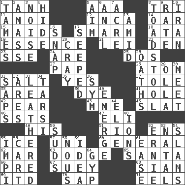 ACROSS 1. Hyperbolic tangent 5. Auto club (abbr.) 8. Three (prefix) 11. Mine, in Marseilles 12. South American Indian 14. Rowing implement 15. Unmarried girls 17. Excessive but superficial compliments 18. "One Day ___ Time" 19. Core 21. Flowery wreath 22. Lair 23. Compass dir. 24. "We ___ not amused" (Victoria) 25. Two (Sp.) 27. Infant food 28. Smallest unit of an element 31. Table seasoning 35. Affirmative reply 37. Lacquered or enameled metalware 38. Length times width 39. Color 41. Hollow 42. Lightbulb-shaped fruit 43. Madame (abbr.) 45. Narrow board 46. Fast planes 47. Biblical high priest 49. Part of HMS, perhaps 51. _ de Janeiro 52. Followers of ems 55. Frozen water 57. Corn or form start 60. Commissioned military rank 62. Impair 63. Evade 65. Before Barbara or Clara 66. Before (prefix) 67. Chop _ 68. Thailand, formerly 69. It would 70. Plant excrement 71. Snakelike fish DOWN 1. Domesticates 2. Collect or gather 3. Annoying sound 4. Flintstone garb 5. Direct toward a target or goal 6. Of or related to the anus 7. 1/640 square mile 8. Inedible or poisonous agaric 9. Assign a rank or rating to 10. SW Asia republic 13. Among 16. Fastener 17. Oozed 20. Supercomputer manufacturer 26. Expletives 29. Spanish pot 30. Rendezvous 31. Plant excrements 32. Ancient Greek god of war 33. Resembling or made to resemble leather 34. Tarsus (plural) 36. Symbol (abbr.) 40. Develop 44. Writer Wiesel 48. Charged particles 50. Soap bubbles 52. Bert's buddy 53. Relating to or accompanying birth 54. Hits or strikes with great force 55. Body of Kaffir warriors 56. Draw slowly or heavily 58. Horse sense 59. The main thing one is thinking about 61. Relaxation 64. Swindle