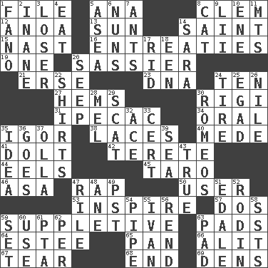 ACROSS 1. Do some clerical work 5. Santa ___, CA 8. Clement's nick name 12. Small Philippine buffalo 13. Player for Phoenix 14. Virtuous person 15. Political cartoonist Thomas 16. Pleas 19. Single 20. More impudent 21. Celtic language 23. Heredity factor (abbr.) 24. "___ Little Indians" 27. Is hesitant and indecisive 30. Swiss mountan, "Queen of the Mountains" 31. Medicinal drug used to evoke vomiting 34. Relating to the mouth 35. Russian composer Stravinsky 38. Shoestrings 40. Ancient Persian 41. Stupid person 42. Cylindrical with tapered ends 44. Snakelike fish 45. Edible starchy tuberous root 46. White ___ sheet 47. Strike 50. One who makes use of a thing 53. Motivate 57. Two (Sp.) 59. Supplying deficiencies 63. Groovy apts. 64. First name in cosmetics 65. Baking dish 66. Came down and settled, as after flight 67. Separate forcefully 68. Conclude 69. Hiding places for outlaws DOWN 1. Papal veil 2. Silly 3. Failure 4. Ingest 5. At sea 6. Religious women 7. Pismires 8. Feline 9. Cards in a Roman deck? 10. Compass dir. 11. Mountains (abbr.) 14. "Two Mules for Sister ____" 17. To free from 18. Car or cant ending 20. Ooze 22. Chest coverings 24. Become fatigued 25. Mild oath 26. Mediterranean tributary 28. Cartoonist voice _ Blanc 29. Go away! 30. Lover boys 32. Adept person 33. Certainty 35. It may be bright or harebrained 36. Travels 37. Spanish pot 39. Ocean 43. Loyal 47. Cause heat under the collar 48. One (Scot) 49. Pacific Standard Time (abbr.) 51. Peak District village in England 52. "The Thinker" sculptor 54. Corncob 55. _ the terrible 56. Tear apart 58. Fast planes 59. Put into a specified state 60. Purpose 61. Parent Teacher Assoc. 62. For each 63. Writing tablet