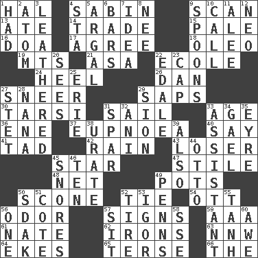 ACROSS 1. Actor Linden 4. Unit of acoustic absorption 9. Glance over 13. Had dinner 14. Swap 15. Diluted with white 16. ___ good deed 17. Match 18. Margarine 19. Mountains (abbr.) 21. White ___ sheet 22. Learning spot: Fr. 24. Person who is morally reprehensible 26. One of the 12 tribes of Israel 27. Scornful expression 29. Plant excrements 30. Tarsus (plural) 31. Move on water 33. Personal question 36. Compass dir. 37. Normal relaxed breathing 40. Declare 41. Small boy 42. Water falling in drops from the sky 43. Failure 45. Play the lead 47. Vertical member of a panel or frame 48. Remaining after all deductions 49. Cooking vessels 50. Biscuitlike quick bread 52. Neckwear 54. Baseball player Mel 56. Scent 57. Attaches a signature 59. American Automobile Association (abbr.) 61. Nathan's nickname 62. Removes the wrinkles 63. Compass dir. 64. Makes supply last 65. Laconic 66. Definite Article DOWN 1. Possessed 2. Tiny particle 3. Resembling or made to resemble leather 4. R.R. building 5. Therefore, facetiously 6. Long, evenly shaped pieces 7. The main thing one is thinking about 8. Born 9. Soup utensils 10. Give a ring to 11. Toward shelter 12. Modern: prefix 20. Perceives with the eye 22. Peak District village in England 23. Head covering 25. One of the Great Lakes 27. Proofreading order 28. Nanny 29. The Jewish people; Israel 31. Practice fight 32. Black tropical American cuckoo 33. Helper 34. Highlander 35. Jane of fiction 38. A salt of uric acid 39. In addition 44. Von Bismarck 45. Sounds asleep 46. Nine, plus one 49. Actor Sean's family 50. Neighbor of Neb. 51. ____ d'Azur (French Riviera) 52. Become fatigued 53. Russian composer Stravinsky 55. Hyperbolic tangent 56. Single 57. Be seated 58. Compass dir. 60. Deep reverence