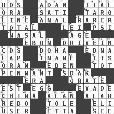 ACROSS 1. Two (Sp.) 4. First of billions? 8. Slanted text style (abbr.) 12. Mouth or opening 13. Suttee (variant) 14. Edible starchy tuberous root 15. Actor's bit 17. Of or related to the anus 18. Less widely known 19. Add up to 21. Luau accessory 23. 23rd letter of the Greek alphabet 24. Relating to the nose 26. Personal question 28. Inky black, to poets 30. Popular '50s hangout 34. Music discs 37. Capital of the state of Qatar 39. Pulitzer Prize-winning author Ferber 40. Infant locale 41. Silly 43. ___ a Wonderful Life 44. NW Algerian seaport 46. Paradise 47. Small child 48. Pre-World Series prize 51. Neighbor of Neb. 54. Epoch 55. Declaim 58. Eastern Standard Time (abbr.) 61. Ovum 63. Elude 65. Large country 67. Actor Alda or Thicke 71. Having or resembling wings 72. Do over again 73. Lacquered or enameled metalware 74. Biblical high priest 75. One who makes use of a thing 76. Singer James 77. Perceive with the eye DOWN 1. Dunce 2. Greek mythologigal hunter 3. Before Barbara or Clara 4. White ___ sheet 5. One of the 12 tribes of Israel 6. _ moment's notice (2 wds.) 7. Place where flour is made 8. Call ___ day 9. Canvas cover 10. Ancient Greek god of war 11. Australian parrot (variant) 16. Comfort 18. Swiss mountan, "Queen of the Mountains" 20. Experiment locale 22. Ewer handle 25. Farming town in central California 27. First lady 29. Music written for nine 30. Natives or inhabitants of Denmark 31. Prepare for publication 32. To the inside or interior of 33. Political cartoonist Thomas 34. Hoof sound 35. Have the gumption 36. Connect, as a bridge 38. Possessed 42. Inside; within (prefix) 45. Compass dir. 49. Type of rug 50. Tired old horse 52. "We ___ not amused" (Victoria) 53. Polynesian shrub of the pepper family 56. Stories 57. Peak District village in England 58. Shade of tan 59. "______ My Girl" (Turtles hit) 60. Event that recurs at intervals 62. Yard entry 64. One of the Great Lakes 66. Not either 68. Car dealer's back yard 69. Keyboard modifier key 70. Teachers' org.