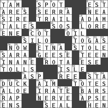 ACROSS 1. Scottish cap 4. Blemish 8. Eastern Standard Time (abbr.) 11. Ancient Greek god of war 13. Spanish missionary in California 15. Teachers' org. 16. Beget 17. Get behind 18. First of billions? 19. Lies 21. Mayday 22. Old wives' tales, e.g. 23. Compass dir. 24. Small bed 27. Lubricate 29. Grain storage tower 30. Ancient Roman robes 34. At this time 36. Inactive volcano in Sicily 39. Fur scarf 40. "Two Mules for Sister ____" 41. Honkers 43. Adolescent 44. Silly 46. Round or rotation of duties 47. Compass dir. 48. For Whom the Bell _____ 49. Capri or Wight 51. Viper 53. To riddle 54. R.R. building 57. Evade 60. Direct toward a target or goal 63. Hauls 65. _ vera 66. Feeling or showing extreme anger 69. Soap units 70. Strike 71. Effrontery 72. Domed church section 73. Followers of ems 74. Lick closed 75. Layer DOWN 1. Clothes sense 2. Believer in; advocate of (suffix) 3. Haggard of country music 4. Fast jet (abbr.) 5. For each 6. Mouths or openings 7. Musical group of three 8. Inside; within (prefix) 9. Burn superficially 10. Not wild 12. Perceive with the eye 14. In addition 18. One to whom something is allotted 20. _-fi 25. Cassini of fashion 26. Carrier 28. ___ a Wonderful Life 29. Tchaikovsky ballet 31. Travels 32. Toward shelter 33. Elected rep. 34. Billionth: prefix 35. Relating to the mouth 37. Modern: prefix 38. Moving about 40. Be seated 42. Relaxation 45. Curvy letter 50. Allow 52. Ache 54. Staphylococcus 55. Laconic 56. NE Netherlands city 57. Have the gumption 58. ____ Bator, Mongolia 59. 911 reaches them 61. Angers 62. Female horse 64. Chief or king in Benin or Nigeria 67. Federal power corp. 68. Snakelike fish