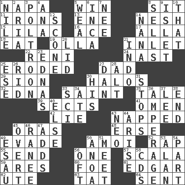 ACROSS 1. California wine valley 5. Victory 8. Be seated 11. Removes the wrinkles 13. Compass dir. 14. Soft 15. Pale purple color 16. Adept person 17. Silent film actress Nazimova 18. Erode 19. Water jar 21. An arm off of a larger body of water 22. Painter Guido (1575-1642) 24. Political cartoonist Thomas 25. Eaten away 27. Male parent 29. The Jewish people; Israel 30. Auras 32. Pulitzer Prize-winning author Ferber 33. Inhabitant of Heaven 35. Story 39. Religious groups 41. Presage 42. Whopper 43. Slept 45. Mouths or openings 48. Celtic language 49. Elude 50. Mine, in Marseilles 52. Strike 55. Post 56. Single 57. Any of the three canals of the cochlea 59. Ancient Greek god of war 60. Enemy 61. _ Allan Poe 62. Shoshoni 63. Make lace 64. Posted DOWN 1. "Death on the ____" 2. Roberta Peters solo 3. Coward 4. Santa ___, CA 5. Welt 6. South American Indian 7. Born 8. Exchanges for money 9. Small island 10. Not this but _ 12. Biscuitlike quick bread 14. Grandmother 20. Hat (slang) 21. _ china 23. Ferber et al. 25. Compass dir. 26. To free from 27. Daniel's nick name 28. The first octave above the treble staff 30. Part of HMS, perhaps 31. Halts 33. _-fi 34. Had dinner 36. Electrical Measurement 37. Area sheltered from the wind 38. Conclude 40. Otherwise 43. Modern: prefix 44. Ascend 45. Unconcealed 46. The wife of a rajah (variant) 47. Sums up 49. Son of Isaac 50. Small Philippine buffalo 51. Confront 53. Actor Alda or Thicke 54. Component 56. Often (poetically) 58. Music discs