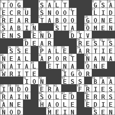 ACROSS 1. Coat; cloak 4. Table seasoning 8. Girls' org. (abbr.) 11. Shade of tan 13. Snout, nose 15. Flaplike covering 16. Stern 17. Off limits 18. Went 19. Unit of acoustic absorption 21. R.R. building 22. Presage 23. Followers of ems 24. Conclude 27. HTML Container Element 29. Letter starter 30. Musical pauses 34. Compass dir. 36. Light colored 39. Nick name for Arthur 40. Be tempered by heat 41. To the left, to Queeg 43. Grandmother 44. Brizilian seaport 46. Inactive volcano in Sicily 47. Single 48. Compose 49. Russian composer Stravinsky 51. Electrically charged atom 53. Double-curved letter 54. Sound made by sheep 57. _ china 60. Period 63. Strips of potato fried in deep fat 65. Precipitation 66. Having a sole or soles 69. Blunders 70. One (Scot) 71. White Person, in Hawaii 72. Singer Brickell 73. Allow head to fall sleepily 74. Count _ (2 wds.) 75. Elected rep. DOWN 1. Laconic 2. Sea 3. Takes hold of 4. Fast jet (abbr.) 5. Santa ___, CA 6. Tennis shots 7. A blast of a horn 8. Take by theft 9. Trig term 10. An important port of Yemen 12. RI univ. 14. Frog relative 18. Head of state? 20. Born 25. California wine valley 26. Window treatment 28. Lyricist Gershwin 29. Accusation by an informer 31. Comedian Laurel of Laurel & Hardy 32. Prong on a fork 33. Ocean 34. Shrivel 35. Suttee (variant) 37. Car dealer's back yard 38. Bert's buddy 40. Compass dir. 42. Labels 45. Lion 50. Order of Saint Francis (abbr.) 52. Soft 54. Avian creatures 55. Nest on high 56. NE Netherlands city 57. SW Asia republic 58. Billionth: prefix 59. Passed on 61. Wander 62. _ vera 64. To sift 67. Biblical high priest 68. Lair