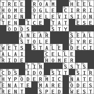 ACROSS 1. Family _ (genealogy) 5. Wander aimlessly 9. The bottom of a shoe or boot 13. Dwelling 14. Stare 15. High-altitude cloud 16. An important port of Yemen 17. Boob tube 19. "___ Little Indians" 20. Frozen water 21. Make lace 22. Compass dir. 23. Likelihood 25. Filthy place 26. Approach 30. Lick closed 34. Fur scarf 35. Jane of fiction 36. Soaks 39. Having lost freshness 42. Tenth: prefix 43. Jai ____ 44. Cell (Danish) 46. Travel on or in a vehicle 47. Simpsons dad 48. Metal container 51. Fast planes 54. Music discs 57. Wedding promise 58. Be seated 60. Title for a knight 62. Subcutaneous 65. Nathan's nickname 66. Related on the mother's side 67. Female horse 68. Lyric poems 69. Monthly bill 70. Moved rapidly 71. Compass direction DOWN 1. Not this but _ 2. Cowboy competition 3. Make improvements or corrections to 4. Car or cant ending 5. College mil. group 6. Double curve, resembling the letter S 7. Everything 8. Confronts 9. Part of HMS, perhaps 10. 4th largest of the Great Lakes 11. Greek god of love 12. Actor's bit 15. Municipality 18. Large container 20. Is not 24. Small ungulate mammals of Africa 27. Greek goddess of the dawn 28. The first octave above the treble staff 29. Arrive at 30. Spring feasts 31. Sight organ 32. Curve 33. Flowery wreath 36. Armed conflict 37. Biblical high priest 38. Bit 40. Lion 41. Shade tree 45. For fear that 48. Periodic rise and fall of the sea level 49. Binary compound 50. Typical standards 52. Sadhe (variant) 53. Settings 54. "Mermaids" star 55. Centimeter-gram-second unit of force 56. Connect, as a bridge 58. The founder of a family 59. On the rocks 61. Relief 63. Baseball player Mel 64. Atlas unit 65. Immediately
