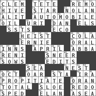 ACROSS 1. Clement's nick name 5. Wig 9. San ____ (Riviera town) 13. Hub of activity 14. Play the lead 15. Pitcher Ryan 16. Set down 17. Car 19. Lubricate 20. RI univ. 21. Daniel's nick name 22. Raised railways 23. Fast planes 25. Environmental prefix 26. Robbery 30. Root beer relative 34. Bert's buddy 35. Taken by mouth 36. Restaurants 39. Showery time 42. Swedish rock group 43. Painter Guido (1575-1642) 44. Scornful expression 46. Sty mamas 47. Proofreads 48. Ocean 51. A home for chicks 54. Sep. follower 57. Rowing implement 58. R.R. building 60. Retirement account (abbr.) 62. Conciliate 65. Northwest Algerian city 66. "_____ Recall" 67. _ gin 68. Make new 69. Broke a traffic law 70. Enthusiasm 71. Toward the sea DOWN 1. US Secretary of Labor Elaine L. _ 2. Ms. Damita and namesakes 3. Vices 4. Was introduced to 5. Russian ruler of old 6. Needle holder 7. Make lace 8. Eat (away) 9. Director Reiner 10. Writer Wiesel 11. Promenade 12. Washington bills 15. Words to Nanette 18. Big _ 20. One who makes use of a thing 24. College paper 27. _ tizzy (2 wds.) 28. Small drink 29. Laconic 30. Unrefined 31. Globe 32. Experiment locale 33. Chicken ___ king 36. Big collection agency 37. Modern: prefix 38. Compass dir. 40. Indiana (abbr.) 41. Luau accessory 45. Inactive volcano in Sicily 48. The visible part of the earth's surface 49. Consume 50. Ascend 52. Male parents of animals 53. Buy and sell 54. Elects 55. Riding implement 56. Carryall 58. Portico 59. Adolescent 61. Small Philippine buffalo 63. Writing tablet 64. Everything 65. Mouth or opening