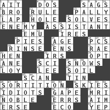 ACROSS 1. Small island 4. Two (Sp.) 7. Settles 11. Sis' sibling 12. General guideline 13. Friendly 14. Infant locale 15. Opening into or through something 16. Finds the solution 17. Foe 19. Aide 21. Australian flightless bird 23. Angers 24. Sliced desserts 25. Personal question 26. Personal Computers (abbr.) 29. Remove soap 30. Followers of ems 31. Actress Charlotte 32. Layer 33. Big collection agency 34. Choose 35. A saturated hydrocarbon 36. _-fi 37. Overwhelms 40. Myrna of the movies 41. Area sheltered from the wind 42. Land 43. Skim 45. Shallow baking pan 46. Decision 51. Atmospheres 55. Foolish or stupid persons 56. Yawn 58. Medical imaging device (abbr.) 59. Impressive in appearance 60. Blunders 61. Direct toward a target or goal 62. Celtic language 63. Environmental prefix 64. Slangy assent DOWN 1. Competent 2. SW Asia republic 3. Drink excessively 4. Superhero pair 5. Water jar 6. Observes 7. Table seasonings 8. Inventor's middle name 9. Small, secluded valley 10. System (abbr.) 12. Poems 13. Introduce or present, as a question 16. Founders of families 18. Count _ (2 wds.) 20. Omens 22. Purpose 24. Abounding in pines 25. Nest on high 26. Move like a hungry wolf 27. Balmoral and tarboosh 28. Put into a specified state 29. Former U.S. Attorney General Janet 32. Actor Linden 33. Ancient Celtic tribe of eastern Britain 36. Narrow boards 37. Fast jet (abbr.) 38. Annoying sounds 39. Pig sound 43. Fur scarf 44. Quote 46. Trig term 47. Aroma 48. Chest bones 49. Double curve, resembling the letter S 50. Drug cop 52. "If ____ say so..." 53. One of the Great Lakes 54. Simple or foolish person 57. Adept person