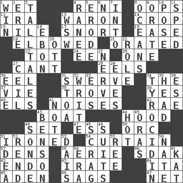 ACROSS 1. Dripping 4. Painter Guido (1575-1642) 8. I made a mistake 12. Retirement account (abbr.) 13. Make _____ (do battle with) 14. Riding implement 15. The longest river in the world 17. Derisive sound 18. Comfort 19. Turned at an angle; bent 21. Spoke pompously 23. Small child 24. Car or cant ending 26. Single 27. Patter 28. Snakelike fish 30. Snakelike fish 31. Turn aside suddenly 34. Definite Article 37. Compete 38. Collection of objects 39. It is so 40. Raised railways 41. Annoying sounds 42. Actress Charlotte 43. Water vessel 44. Parka part 46. Arrange properly for use 47. Double-curved letter 50. The grampus (Milton) 51. Pressed 54. Window treatment 57. Cub Scout units 58. Nest on high 60. Neighbor of Neb. 62. Inside; within (prefix) 63. Feeling or showing extreme anger 64. Call ___ day 65. An important port of Yemen 66. Droops 67. Fish or hair follower DOWN 1. Victory 2. 4th largest of the Great Lakes 3. Baron Munchausen's specialties 4. The wife of a rajah (variant) 5. Eat (away) 6. Not either 7. To the inside or interior of 8. Seas 9. Declaim 10. Airs 11. Drove too fast 13. Compass dir. 16. Inky black, to poets 20. Baseball player Mel 22. Hero or heavy, e.g. 25. Impudent aggressiveness 27. To provide with a ceiling 29. Nights before holidays 30. Night before a holiday 31. Portico 32. Compose 33. Greek goddess of the dawn 34. Polypeptide antibiotic 35. Froth on beer 36. Compass dir. 41. Observe 43. Gillaume's butler role 44. Being at a high temperature 45. Mouths or openings 46. Something which is sent 48. Lean end of the neck 49. Sets of matching outer garments 51. The content of cognition 52. Tear apart 53. Raised platform 55. To sift 56. Nathan's nickname 59. Epoch 61. Krazy ___ of comics