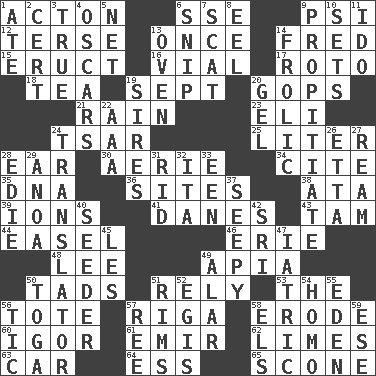 ACROSS 1. NE Massachussets city 6. Compass dir. 9. 23rd letter of the Greek alphabet 12. Laconic 13. At one time in the past 14. Flintstone 15. Spew [out] 16. Small bottle 17. Printing process, for short 18. Afternoon social gathering 19. Back-to-school mo. 20. Republicans 21. Water falling in drops from the sky 23. Connecticut Ivy Leaguer 24. Russian ruler of old 25. 61 cubic inches 28. Hearing organ 30. Nest on high 34. Quote 35. Heredity factor (abbr.) 36. Locates 38. _ moment's notice (2 wds.) 39. Charged particles 41. Natives or inhabitants of Denmark 43. Scottish cap 44. Artist's stand 46. One of the Great Lakes 48. Area sheltered from the wind 49. Capital of Western Samoa 50. Small amounts or degrees 51. Trust 53. Definite Article 56. Lug 57. Port city in Latvia 58. Wear away 60. Composer Stravinsky 61. Independent ruler or chieftain 62. Citrus fruits 63. 4-wheeled motor vehicle 64. Double-curved letter 65. Biscuitlike quick bread DOWN 1. Had dinner 2. An absolute certainty 3. Loyal 4. Motion picture awards 5. Remaining after all deductions 6. Sever or remove by pinching or nipping 7. Scram! 8. Snakelike fish 9. Appease 10. Puts into a specified state 11. Wedding promise 13. Baking chamber 14. Romp 19. Male parents of animals 20. Set 22. Auto club (abbr.) 24. Interpreter 26. Singer James 27. 480, 500 or 516 sheets of paper 28. Singer Brickell 29. Small Philippine buffalo 31. To free from 32. Call ___ day 33. Car or cant ending 37. Not well drained, as in land 40. Sowing specialist 42. _ Lanka 45. French article 47. Of or pertaining to medicine 49. Having or resembling wings 50. Ancient Roman robe 51. Basketball hoops 52. Armor plate that protects the chest 54. Like (prefix) 55. Locale of original sin 56. Nervous spasm 57. Portuguese money of account (variant) 58. Raised railways 59. Compass dir.
