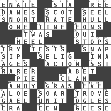 ACROSS 1. Maternal 6. R.R. building 9. To separate or throw off 12. Natives or inhabitants of Denmark 13. Highlander 14. Stitch closed the eyes of (a falcon) 15. Derisive sound 16. Assign a rank or rating to 17. Frame or body of a ship 18. Single 19. Prong on a fork 20. Immeasurably long periods of time 21. It was, poetically 23. Fr. "Yes" 24. Person who is morally reprehensible 25. Constricts 28. Attempt to accomplish something 30. Trials 34. Fastener 35. Small drink 36. Former Milwaukee Brewers owner Bud 38. _ tizzy (2 wds.) 39. Matures 41. NE Massachussets city 43. Fast jet (abbr.) 44. More valued for its uncommonness 46. Collude with 48. Sliced dessert 49. Dollar (slang) 50. "60 Minutes" Commentator Rooney 51. Pate de foie ____ 53. Night before a holiday 56. Medicinal plant 57. Fly high 58. Collection of objects 60. Highlander 61. A single undivided whole 62. Stares at amorously 63. Epoch 64. Car or cant ending 65. Honkers DOWN 1. Begley and Asner 2. Billionth: prefix 3. At once, immediately (arch.) 4. Cylindrical with tapered ends 5. Eastern Standard Time (abbr.) 6. Examine hastily 7. Carry 8. Had dinner 9. One who advocates reunion 10. Snakelike fish 11. Pipe bend 13. Indian titles of respect 14. Yells 19. Lies 20. Greek goddess of the dawn 22. Dripping 24. Abnormally rapid or deep breathing 26. Zero-star reviews 27. Argument over a trivial matter 28. Russian ruler of old 29. Port city in Latvia 31. Ocean 32. Affectionate concern, for short 33. Be seated 37. Scores awarded for successful feats 40. A glass for beer 42. Basketball assoc. 45. Marina Del _, California 47. Develop 49. Haul 50. Having or resembling wings 51. Went 52. Water falling in drops from the sky 54. Short-tailed, large-bodied rat 55. Nights before holidays 56. Personal question 57. Take to court 58. Coat; cloak 59. Compass dir.