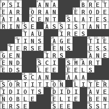 ACROSS 1. 23rd letter of the Greek alphabet 4. Santa ___, CA 7. Cy Young winner Saberhagen 11. Hearing organ 12. Northwest Algerian city 13. Eat (away) 14. "One Day ___ Time" 15. Penny 16. Chalkboards 17. Wash lightly 19. Aide 21. The 19th letter of the Greek alphabet 23. Angers 24. Airtight sealed metal containers 25. Grow older 26. Standoff 29. Laconic 30. Followers of ems 31. Double-curved letter 32. Commissioned military rank (abbr.) 33. Big collection agency 34. A saturated hydrocarbon 35. Conclusion 36. _-fi 37. Don Adams' spy role 40. Begley and Asner 41. Area sheltered from the wind 42. Snakelike fish 43. Examine minutely or intensely 45. Auto club (abbr.) 46. Conclusion 51. 61 cubic inches 55. Foolish or stupid persons 56. "You Light Up My Life" star Conn 58. "___ Maria" 59. Having high moral qualities 60. Writer Wiesel 61. Benjamin's nick name 62. Celtic language 63. Observe 64. Fast jet (abbr.) DOWN 1. Lightbulb-shaped fruit 2. Suttee (variant) 3. SW Asia republic 4. "We ___ not amused" (Victoria) 5. Grandmother 6. Pismires 7. Naughty children 8. Round or rotation of duties 9. Genesis locale 10. Trial 12. Seas 13. Otherwise 16. Begets 18. Disorderly outburst 20. Public displays of written messages 22. Purpose 24. Watches over 25. Nest on high 26. Rends 27. Is not 28. Compass dir. 29. Look after 32. Turn to the right 33. Ancient Celtic tribe of eastern Britain 36. Narrow boards 37. Ocean 38. Ear of corn 39. Jai ____ 43. Took without asking 44. Quote 46. Trig term 47. Aroma 48. Teases 49. Lyric poems 50. "Death on the ____" 52. Bar bills 53. Nights before holidays 54. Monthly bill 57. Expire