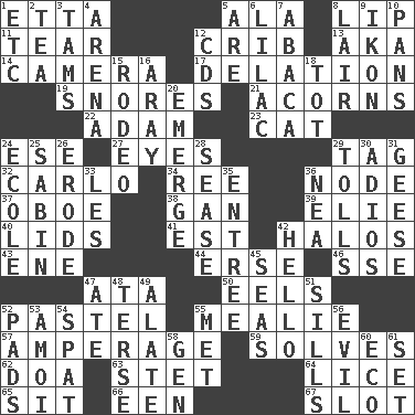 ACROSS 1. Singer James 5. According to 8. Mouth edge 11. Rend 12. Baby bed with high sides 13. Alias (abbr.) 14. Device for capturing images 17. Accusation by an informer 19. Sounds asleep 21. Oak nuts 22. First of billions? 23. Feline 24. Compass dir. 27. Sight organs 29. Label 32. Monte _, Las Vegas Hotel/Casino 34. Portuguese money of account (variant) 36. Connecting point 37. Mitch Miller's instrument 38. Separate the seeds from cotton 39. Writer Wiesel 40. Hats (slang) 41. Eastern Standard Time (abbr.) 42. Saint headwear 43. Compass dir. 44. Celtic language 46. Compass dir. 47. _ moment's notice (2 wds.) 50. Snakelike fish 52. Soft color 55. Ear of corn 57. Electrical Measurement 59. Finds the solution 62. ___ good deed 63. Proofreading order 64. Louse (plural) 65. Be seated 66. Car or cant ending 67. Notch DOWN 1. And so on (abbr.) 2. Afternoon social gathering 3. Scottish caps 4. Sports stadium 5. "We ___ not amused" (Victoria) 6. Pale purple color 7. Phillipine bananalike plant 8. Den 9. Visual representation of an object 10. Baking dishes 12. Music discs 15. Cowboy competition 16. Like ___ of sunshine 18. Small child 20. Develop 24. Learning spot: Fr. 25. Unit of acoustic absorption 26. Wear away 28. Gospel singer Marvin 29. For Whom the Bell _____ 30. Goodbye (Sp.) 31. Honkers 33. French article 35. Main course 36. Teachers' org. 42. Phone greeting 45. Oceans 47. Had dinner 48. Laconic 49. Having winglike extensions 51. Beverly of Met fame 52. Writing tablets 53. Mine, in Marseilles 54. Argument over a trivial matter 55. Was introduced to 56. Tending to cause great harm 58. Commissioned military rank (abbr.) 60. Environmental prefix 61. Put into a specified state